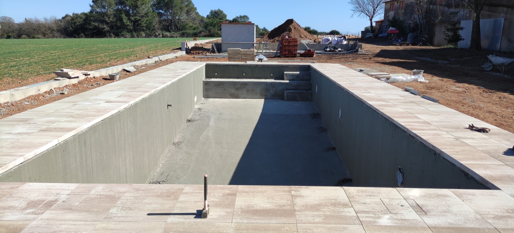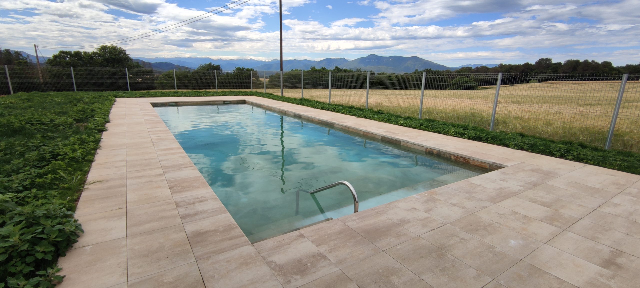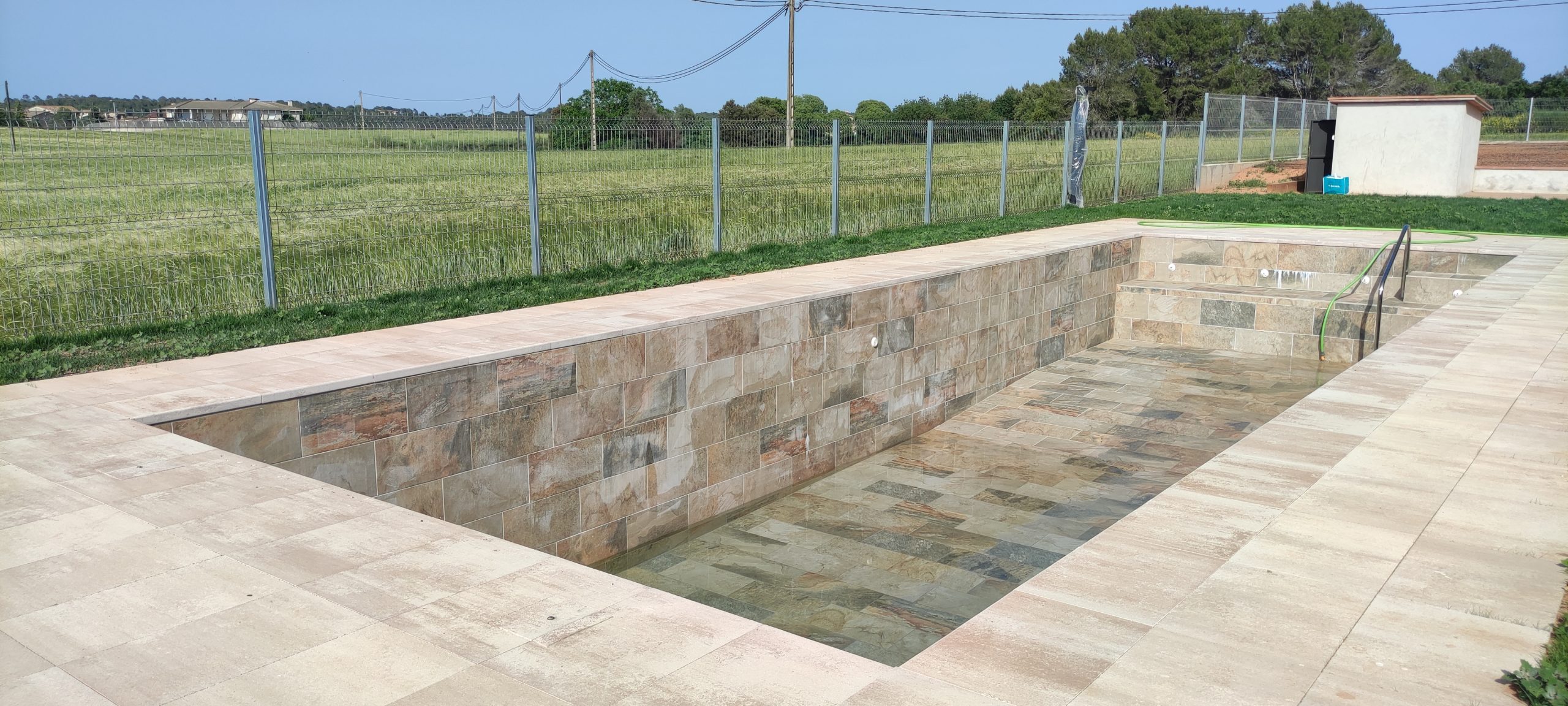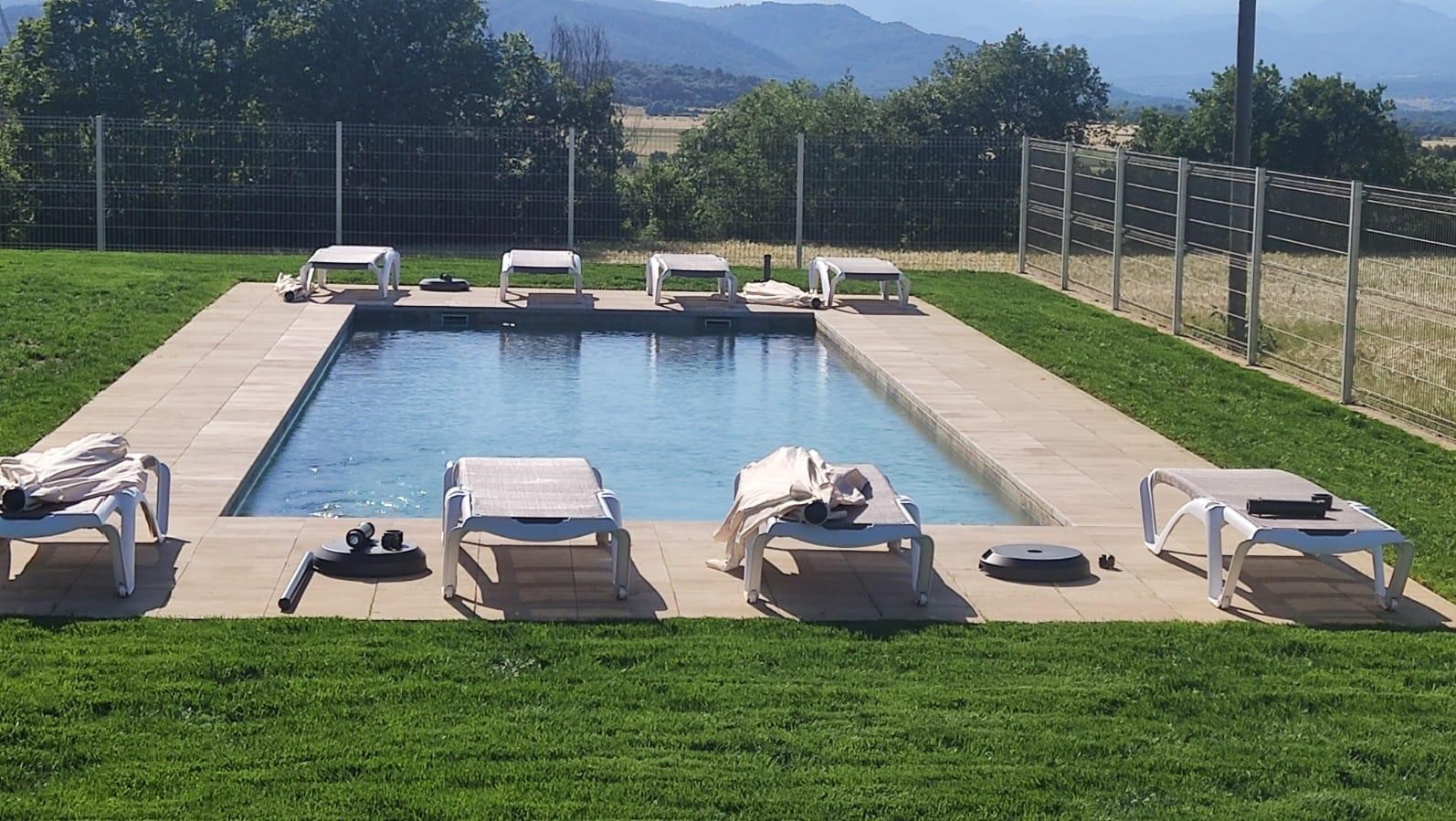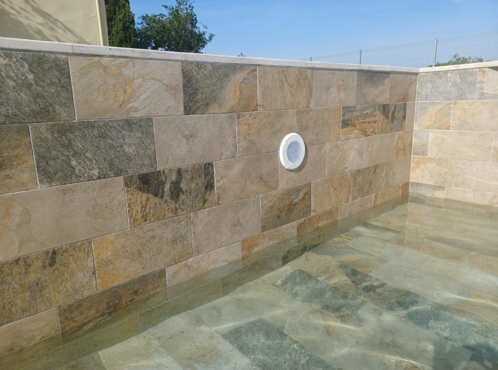Piscina amb revestiment gres porcelànic de la casa Mykonos Cerámicas model Aspen Tierra (peça de mides 30 x 60 cms). Escala i banc d’obra a l’interior de la piscina.