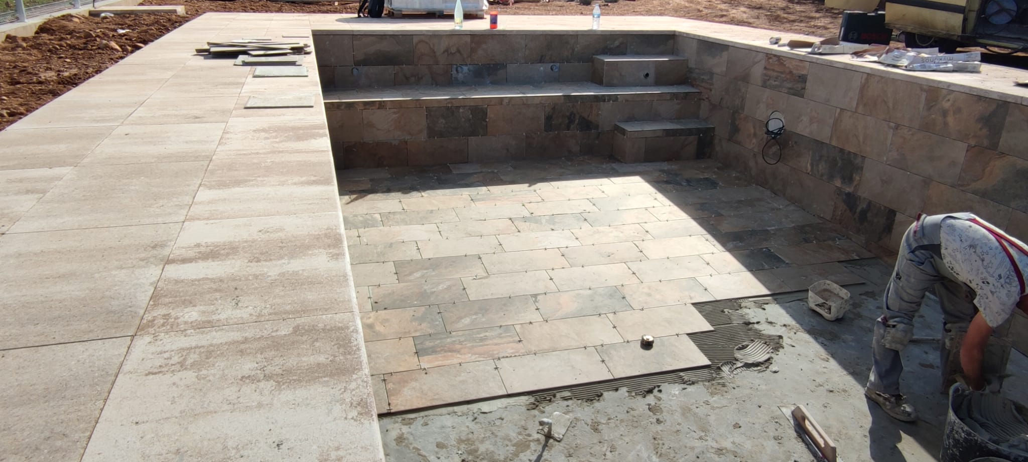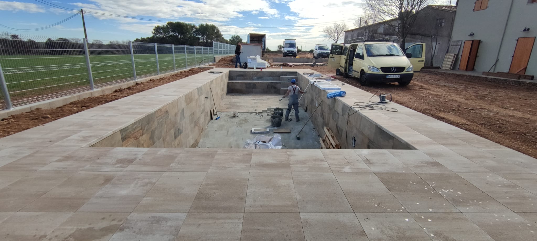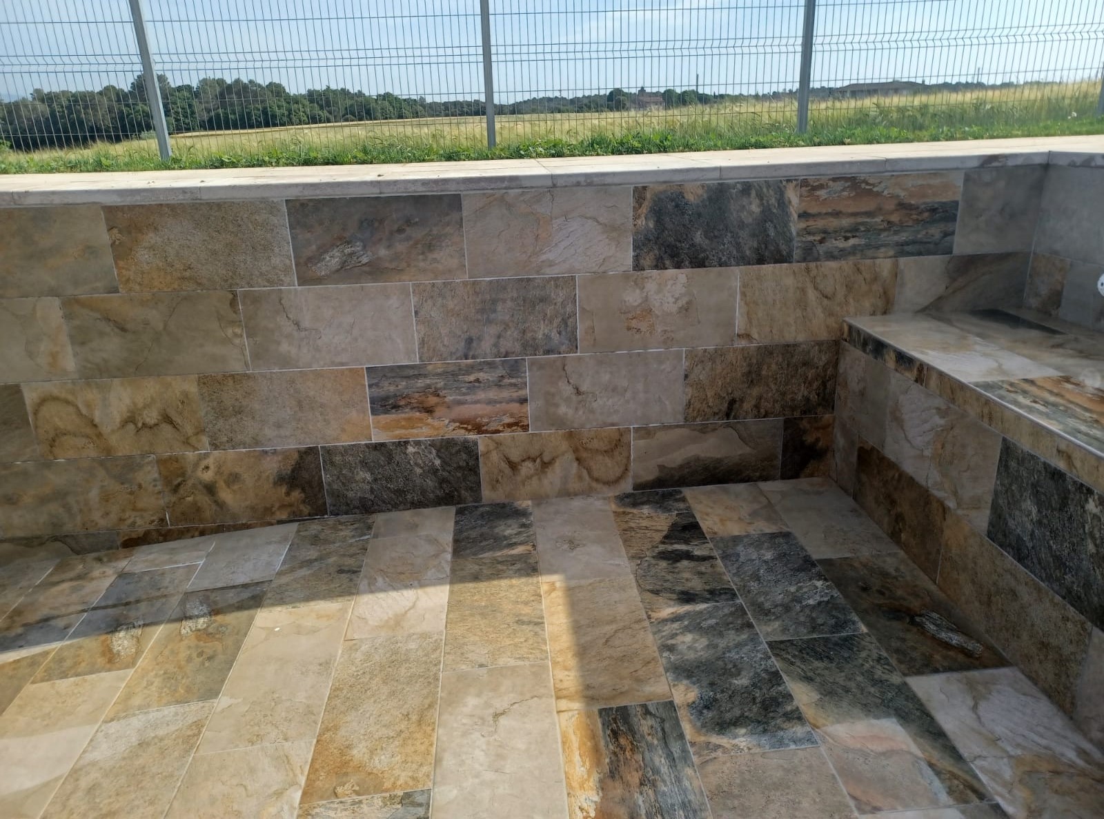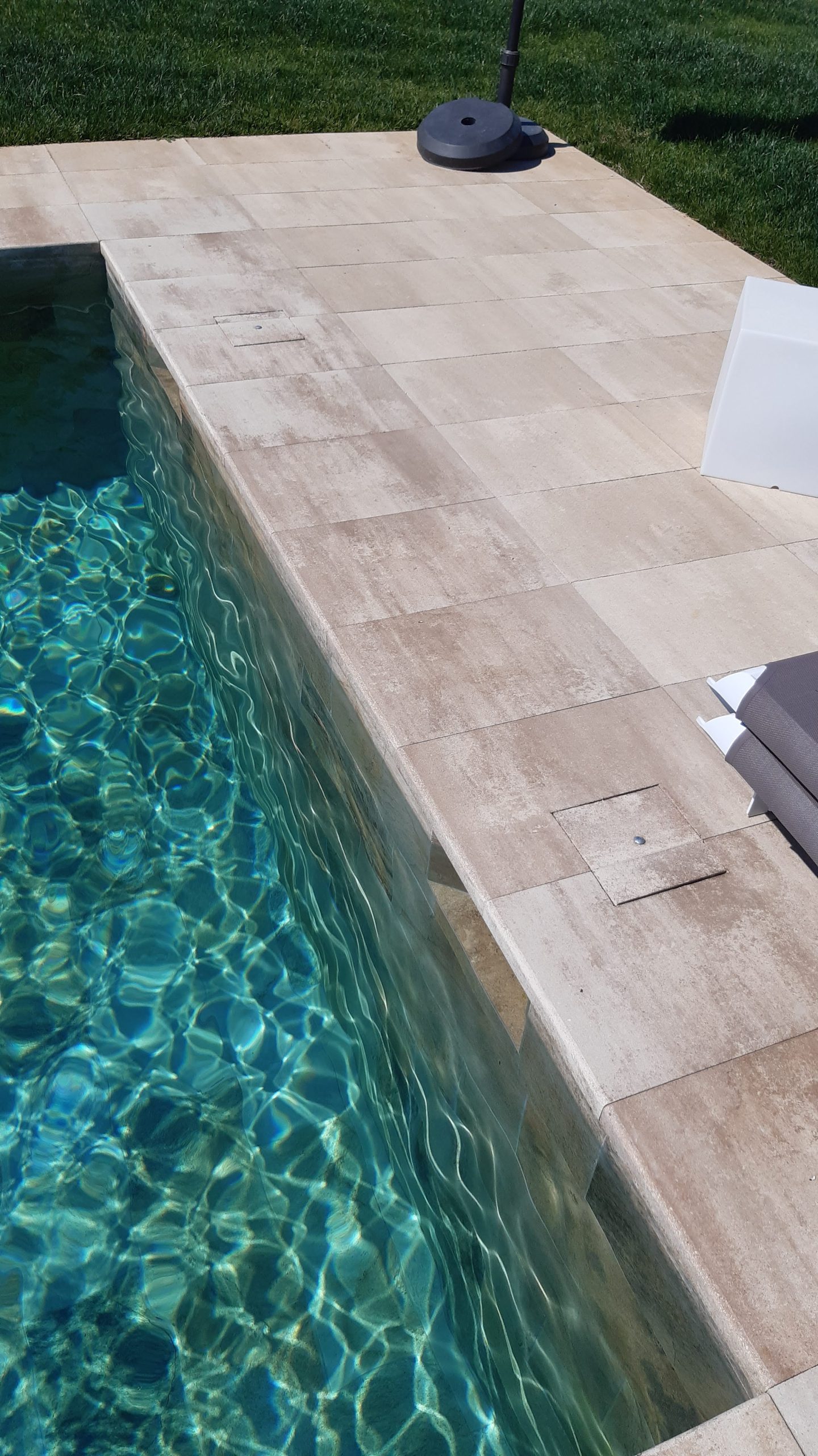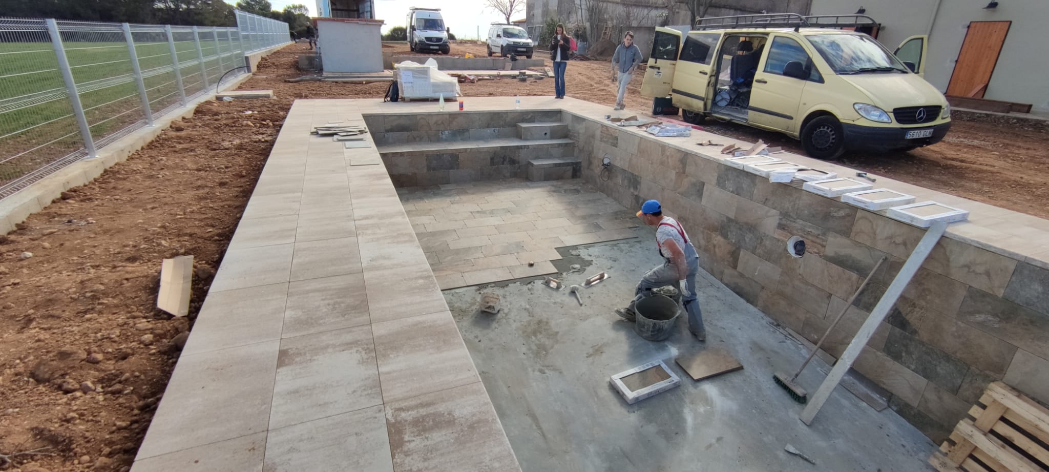 Piscina amb revestiment gres porcelànic de la casa Mykonos Cerámicas model Aspen Tierra (peça de mides 30 x 60 cms). Escala i banc d’obra a l’interior de la piscina.