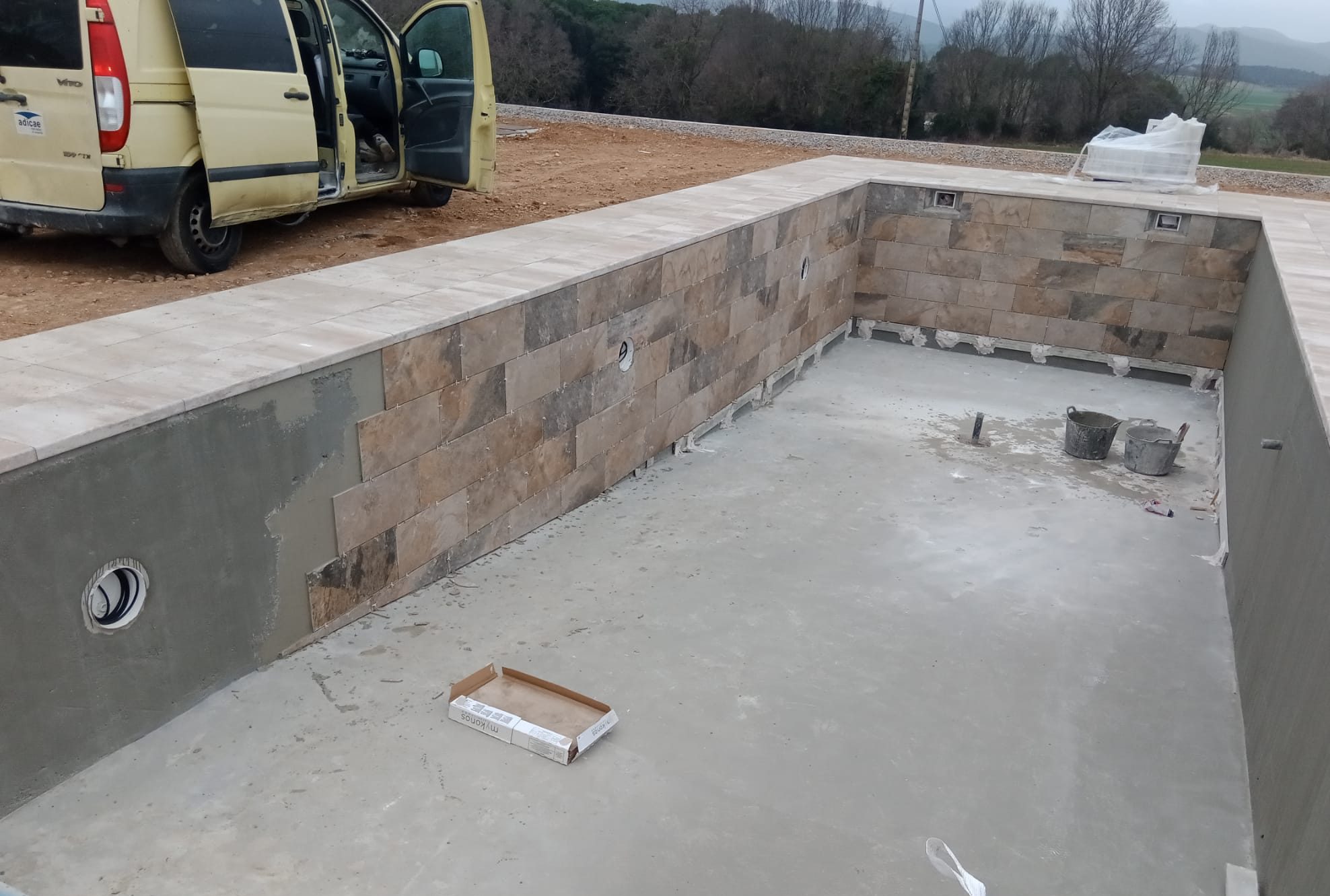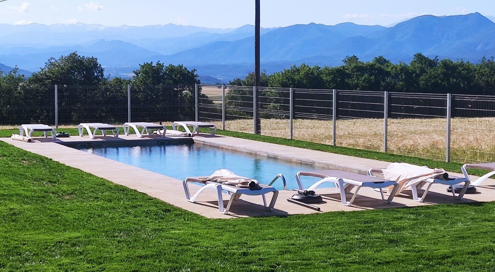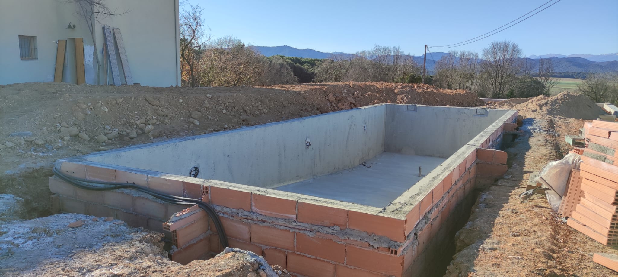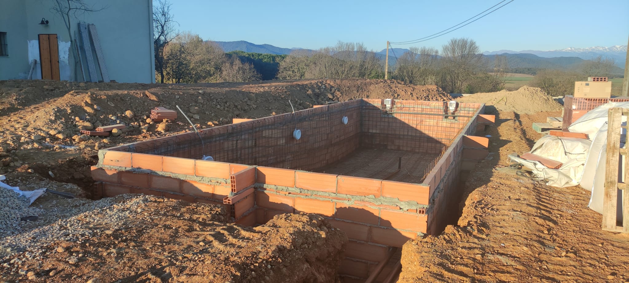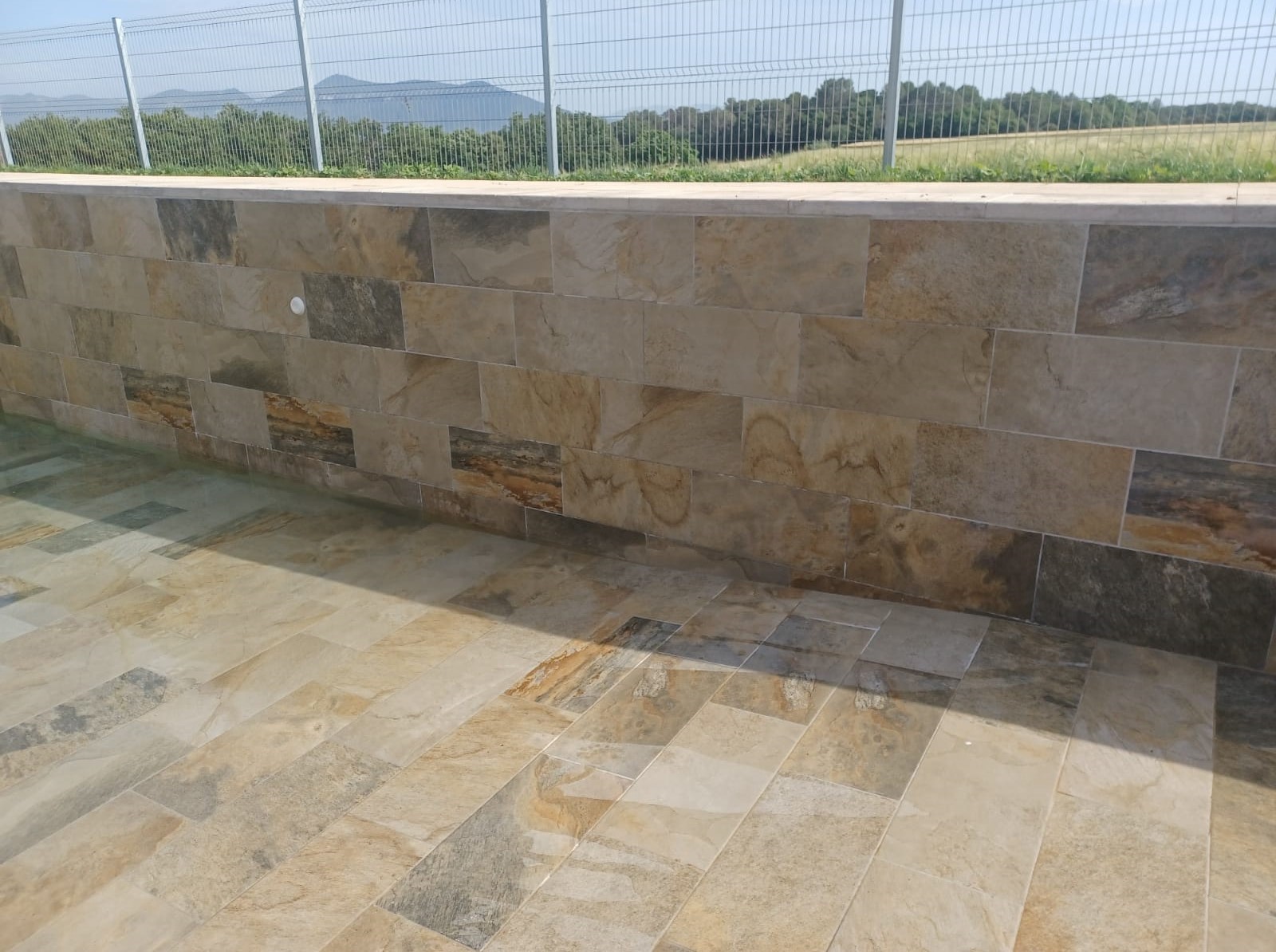 Piscina amb revestiment gres porcelànic de la casa Mykonos Cerámicas model Aspen Tierra (peça de mides 30 x 60 cms). Escala i banc d’obra a l’interior de la piscina.