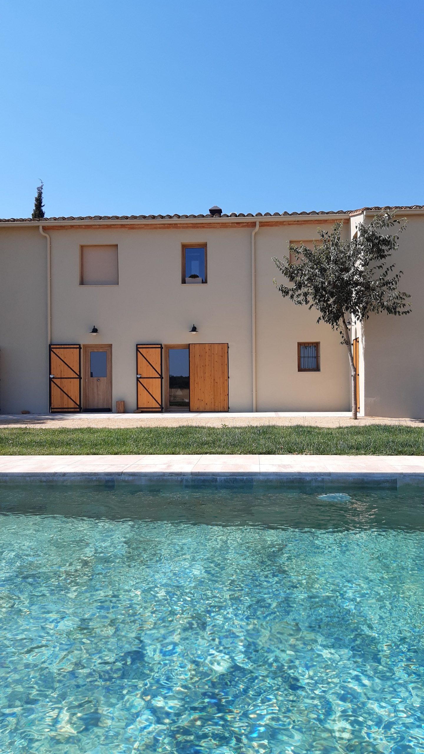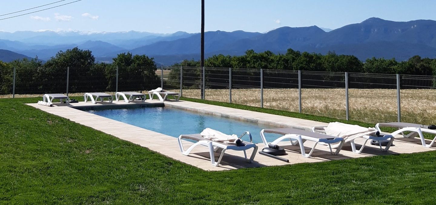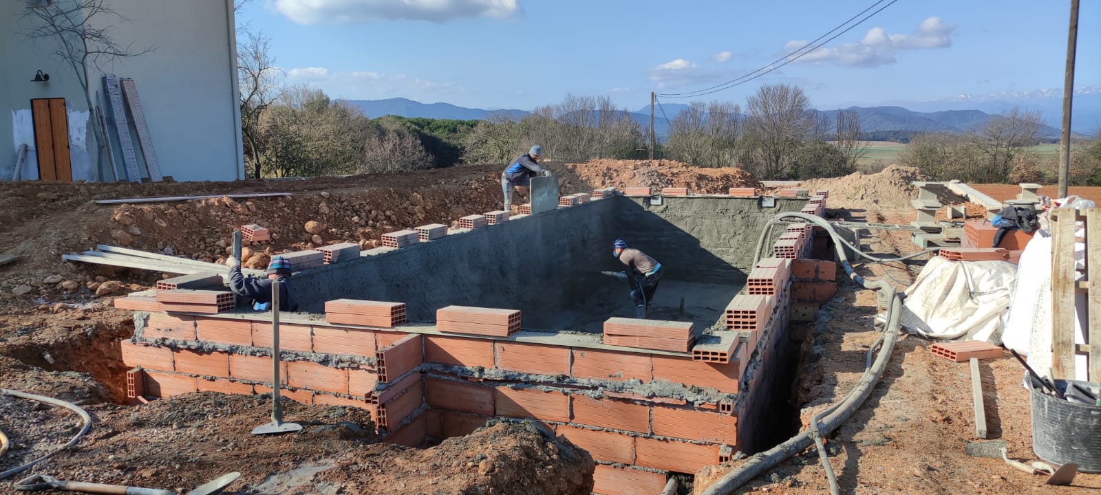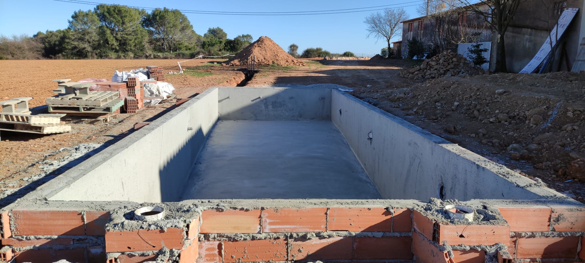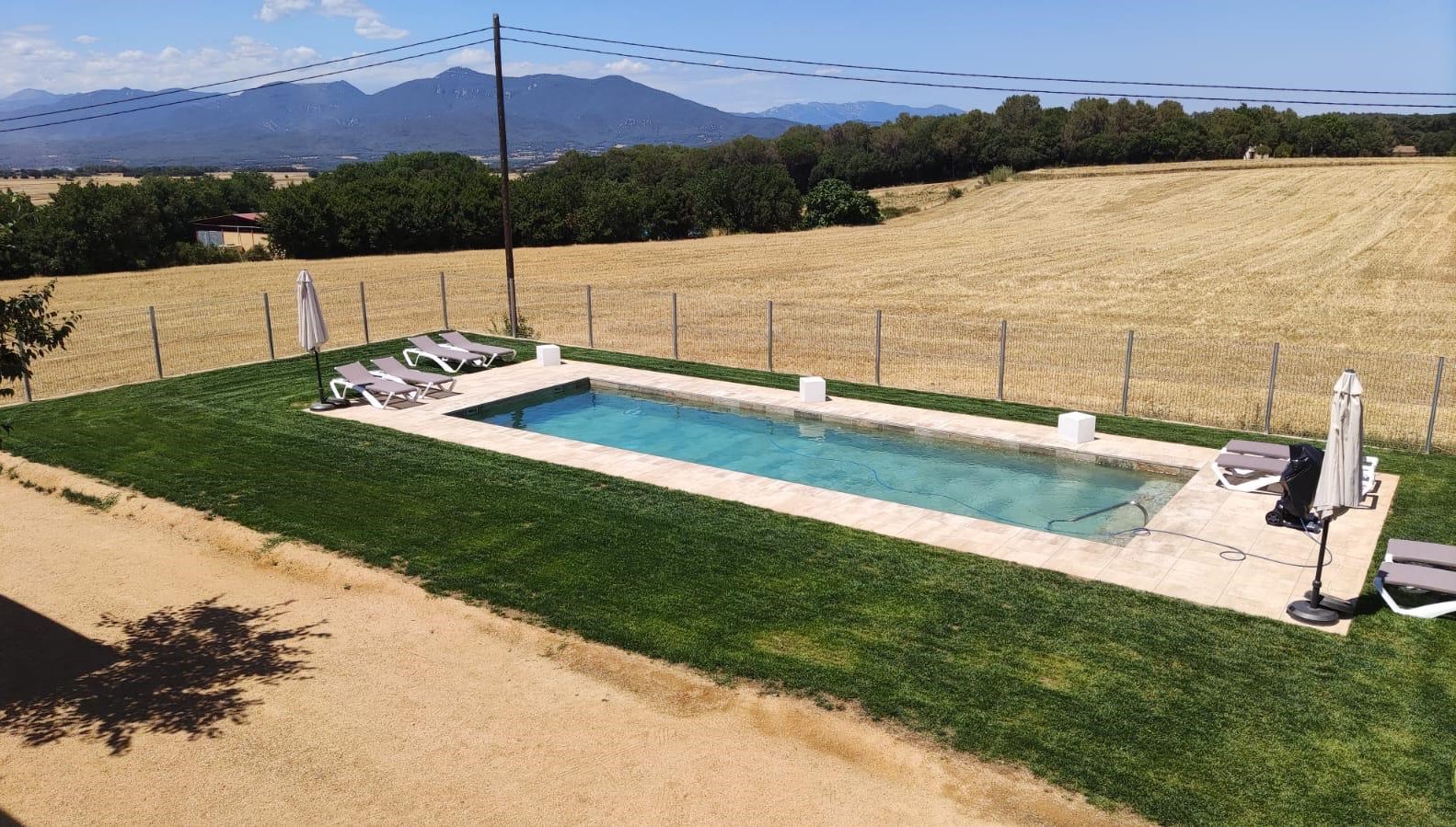 Piscina amb revestiment gres porcelànic de la casa Mykonos Cerámicas model Aspen Tierra (peça de mides 30 x 60 cms). Escala i banc d’obra a l’interior de la piscina.