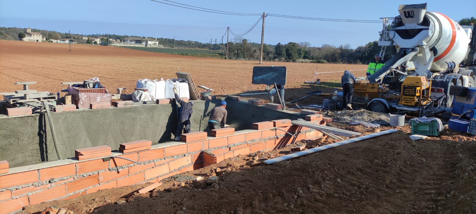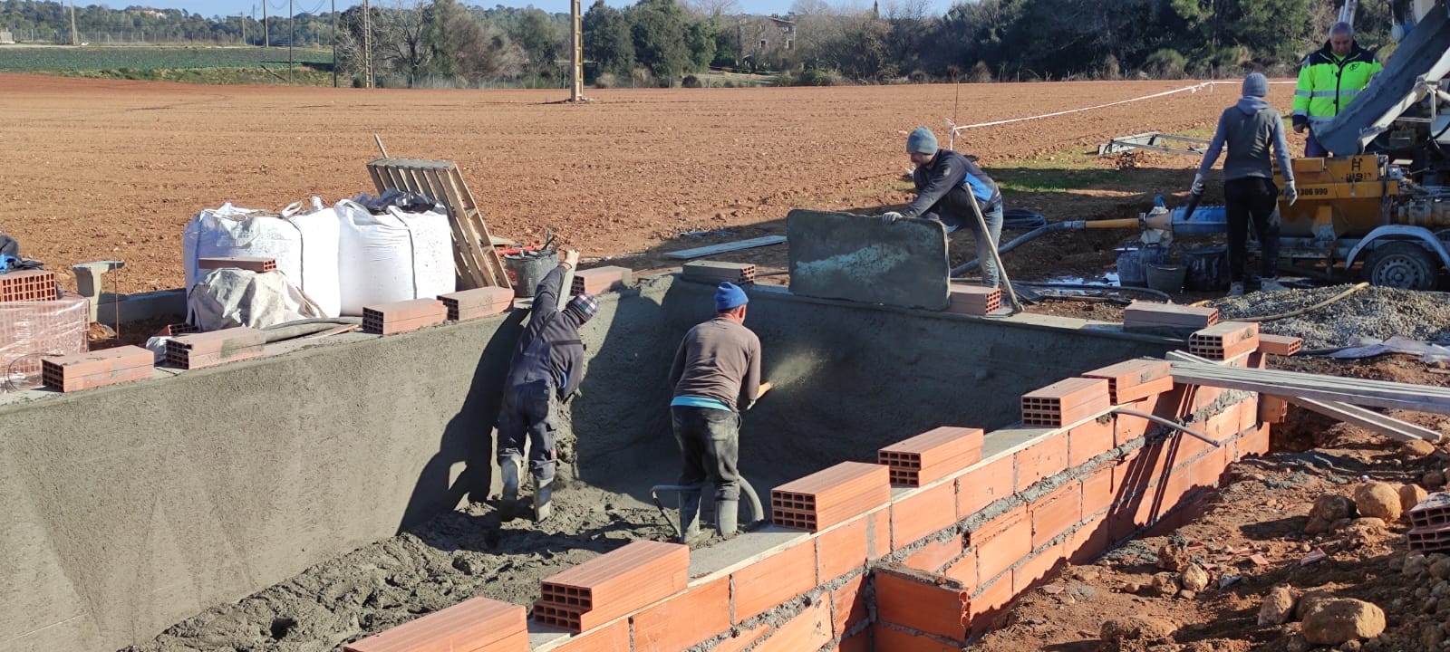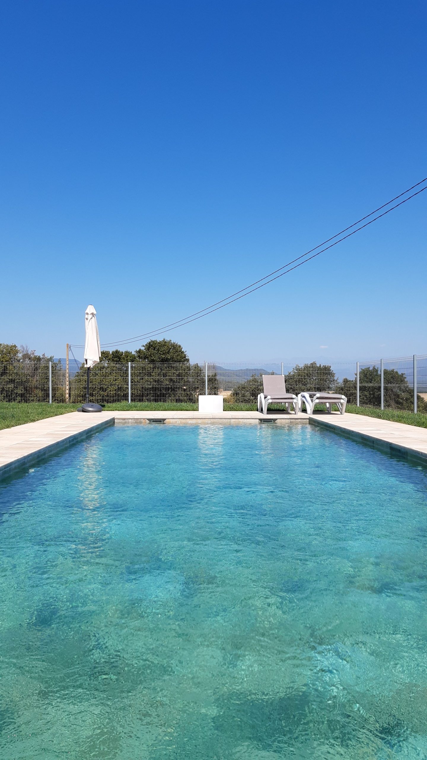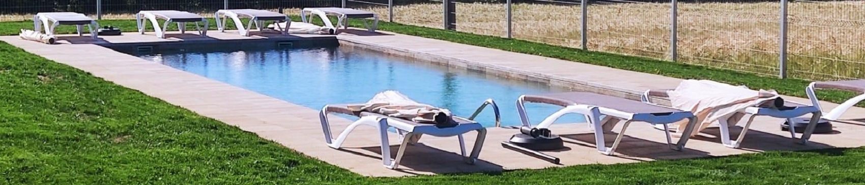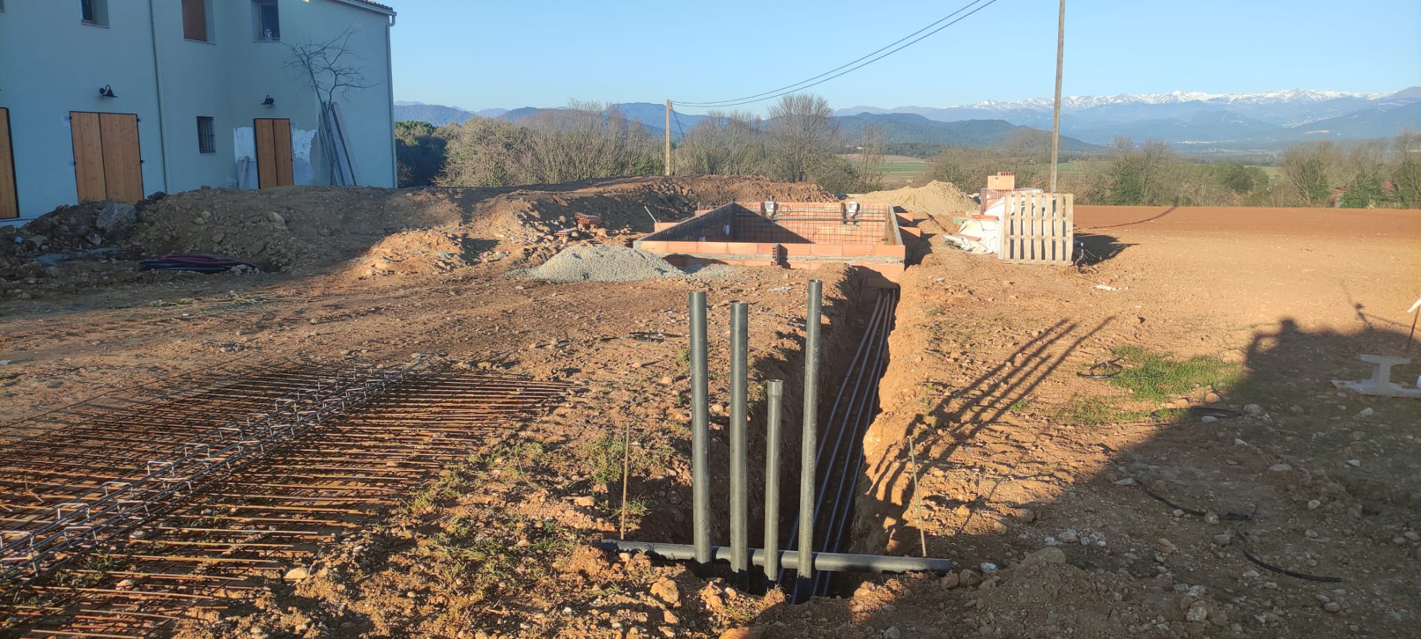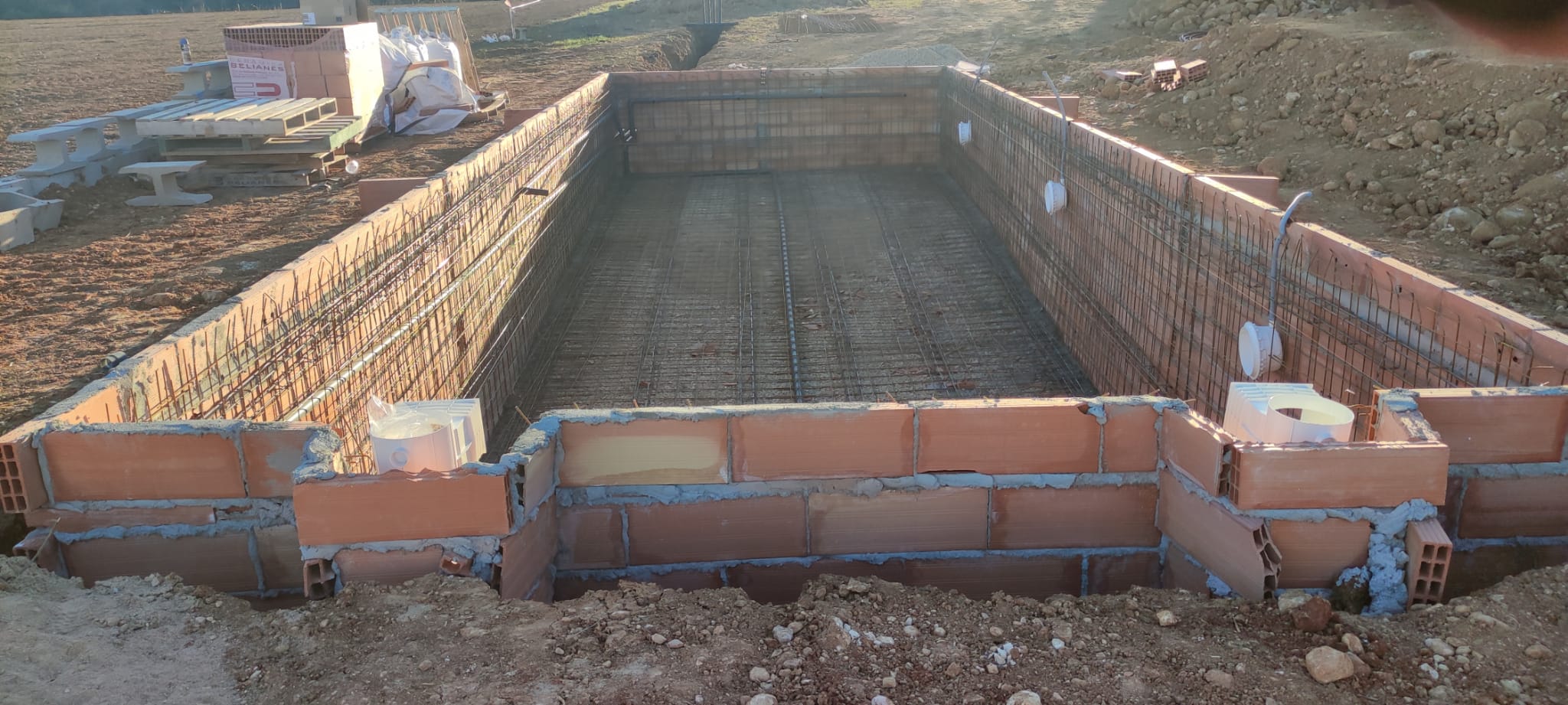Piscina amb revestiment gres porcelànic de la casa Mykonos Cerámicas model Aspen Tierra (peça de mides 30 x 60 cms). Escala i banc d’obra a l’interior de la piscina.