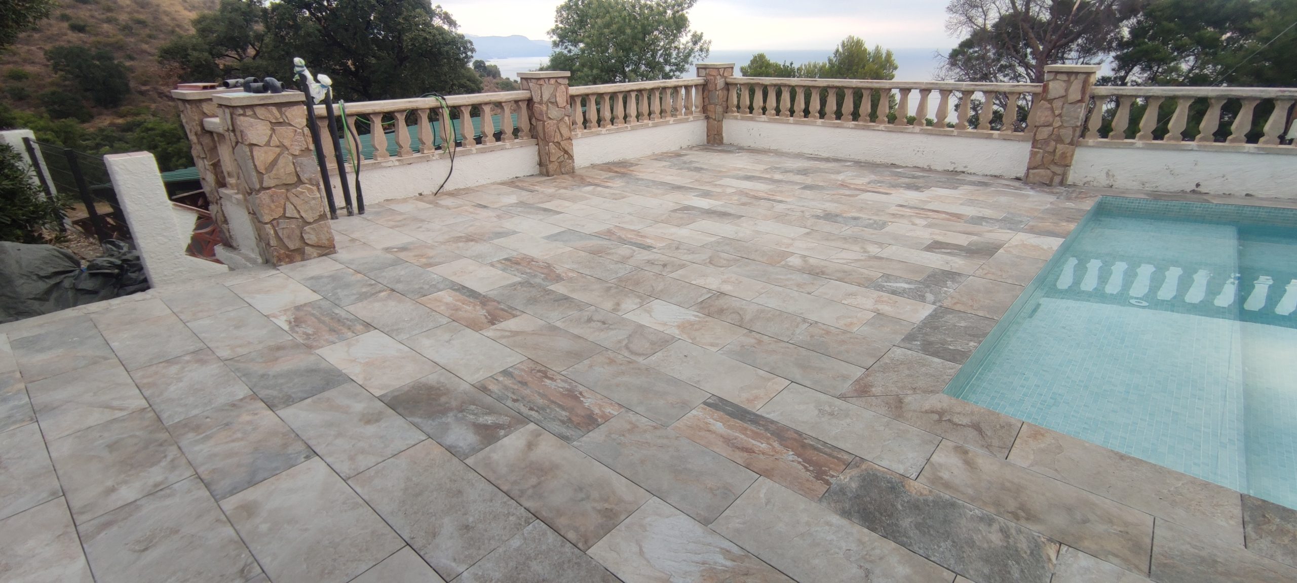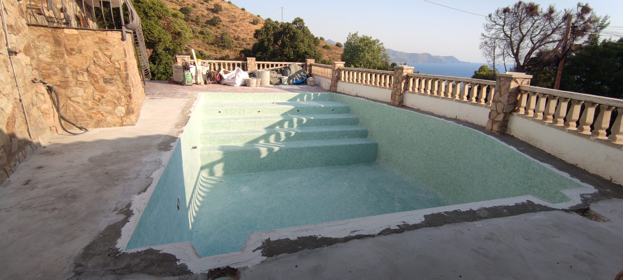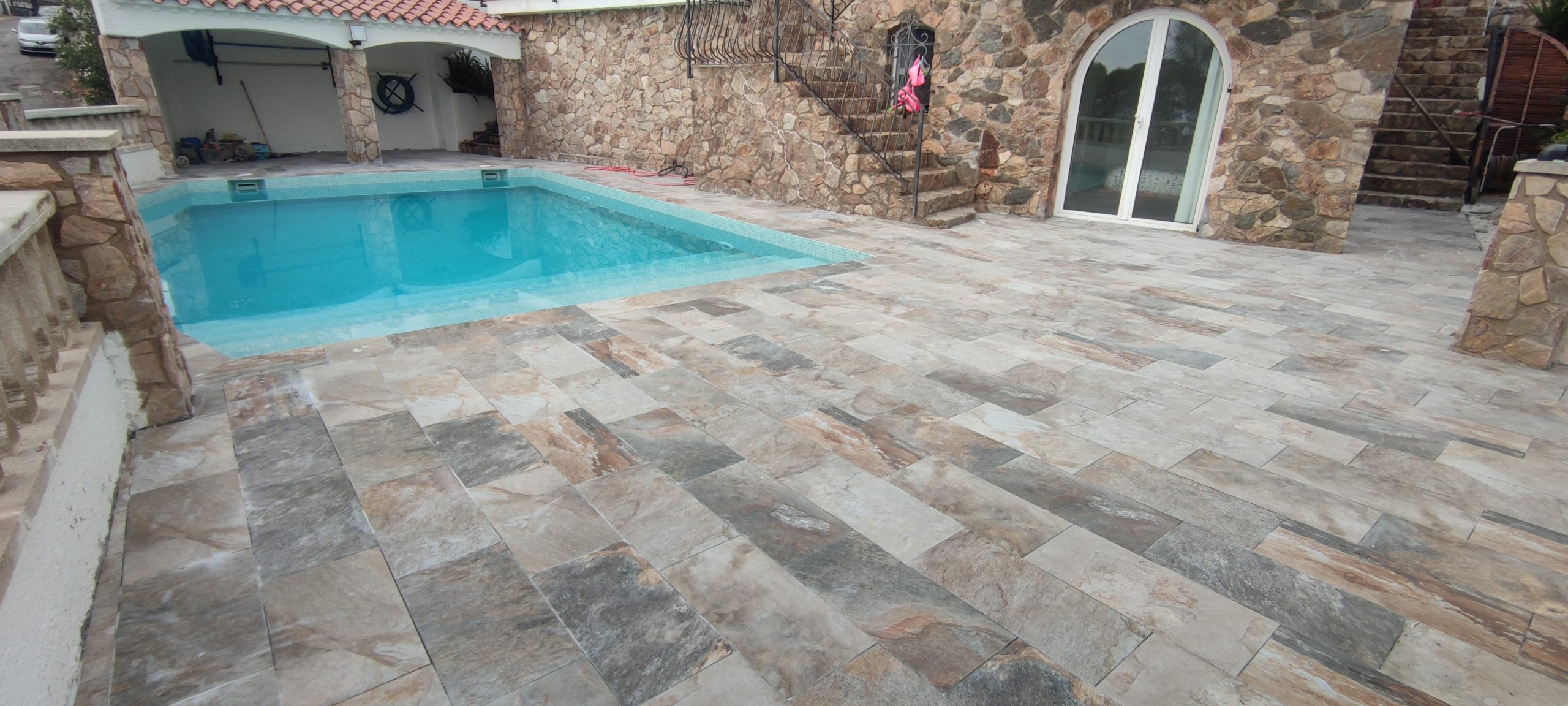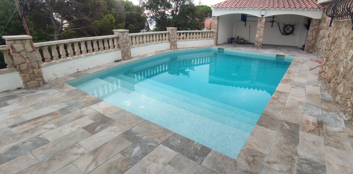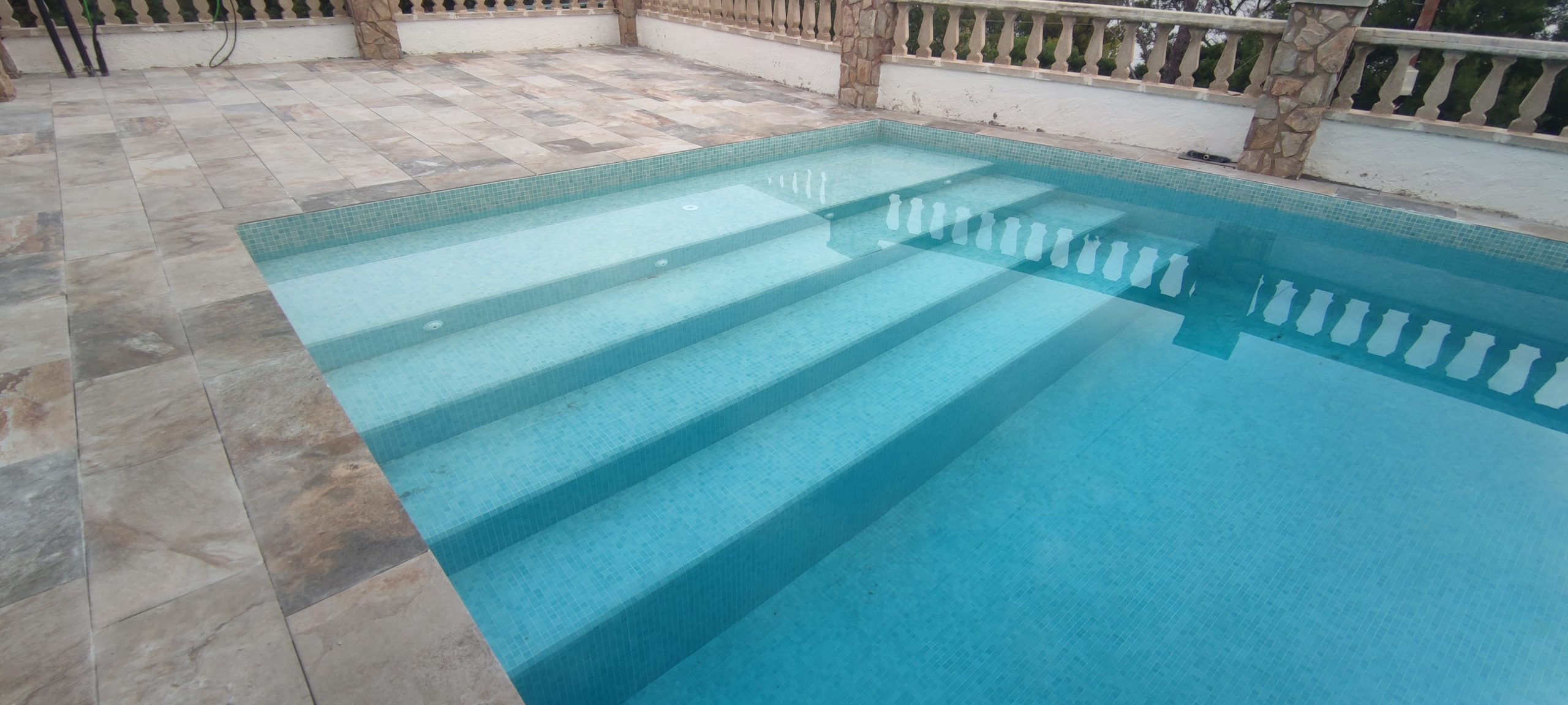 Piscina amb revestiment micromosaic vítric de la casa Squamers model Genuine 102 (peça de mides 25 x 25 mm). Escala de costat a costat i primer esglaó amb zona de platja. Coronació i terrassa amb gres porcelànic de la casa Mykonos Cerámics model Aspen Tierra (peça de 30 x 60 cms).