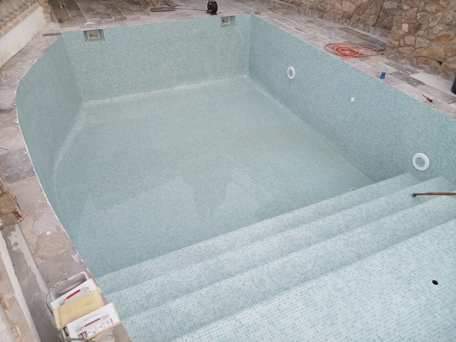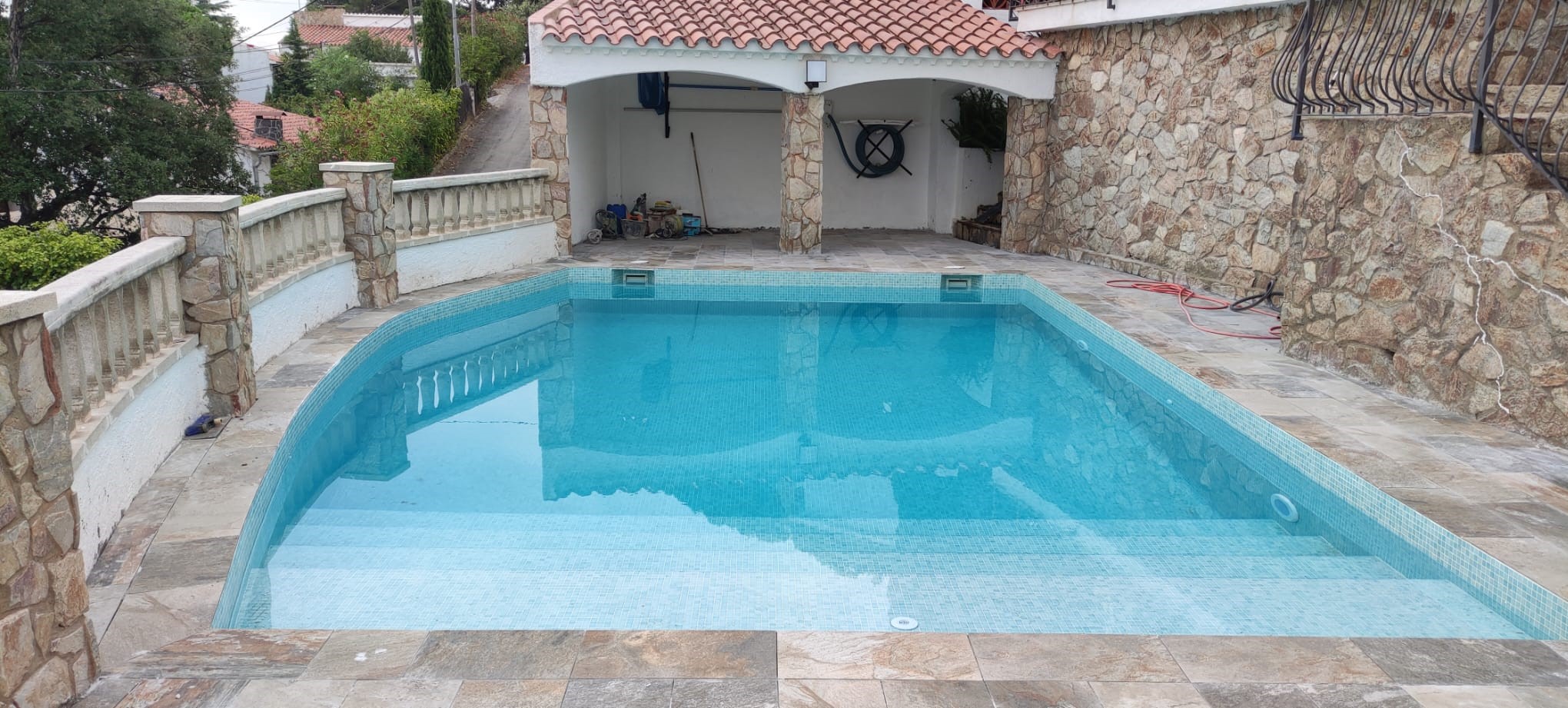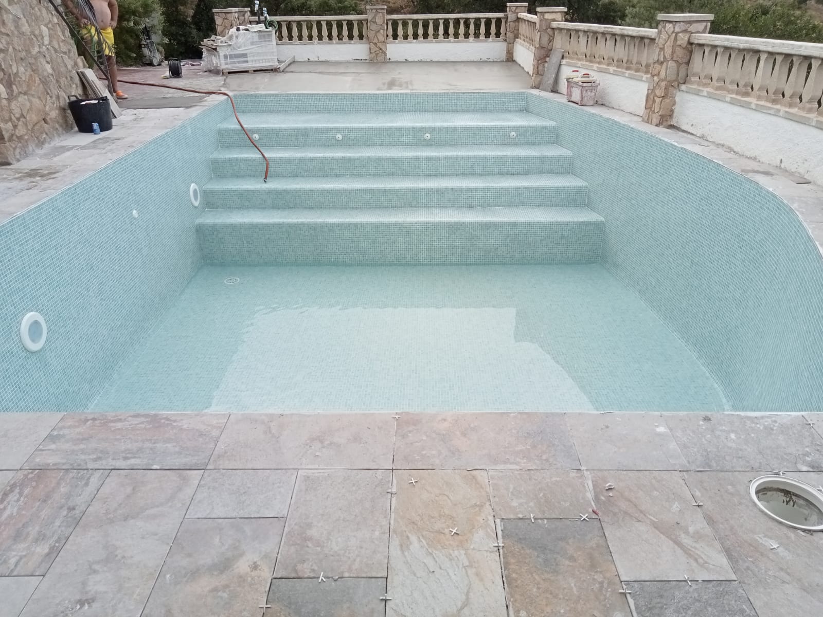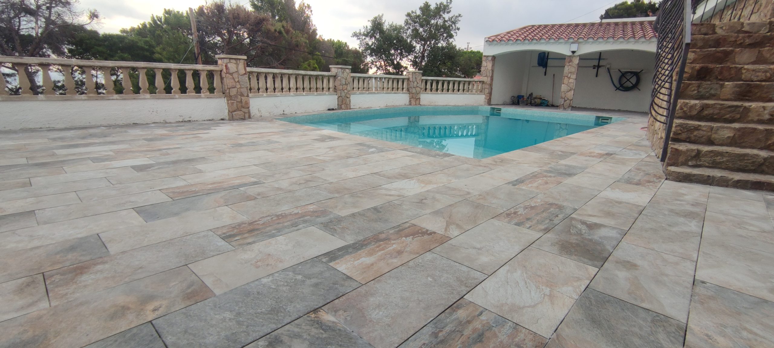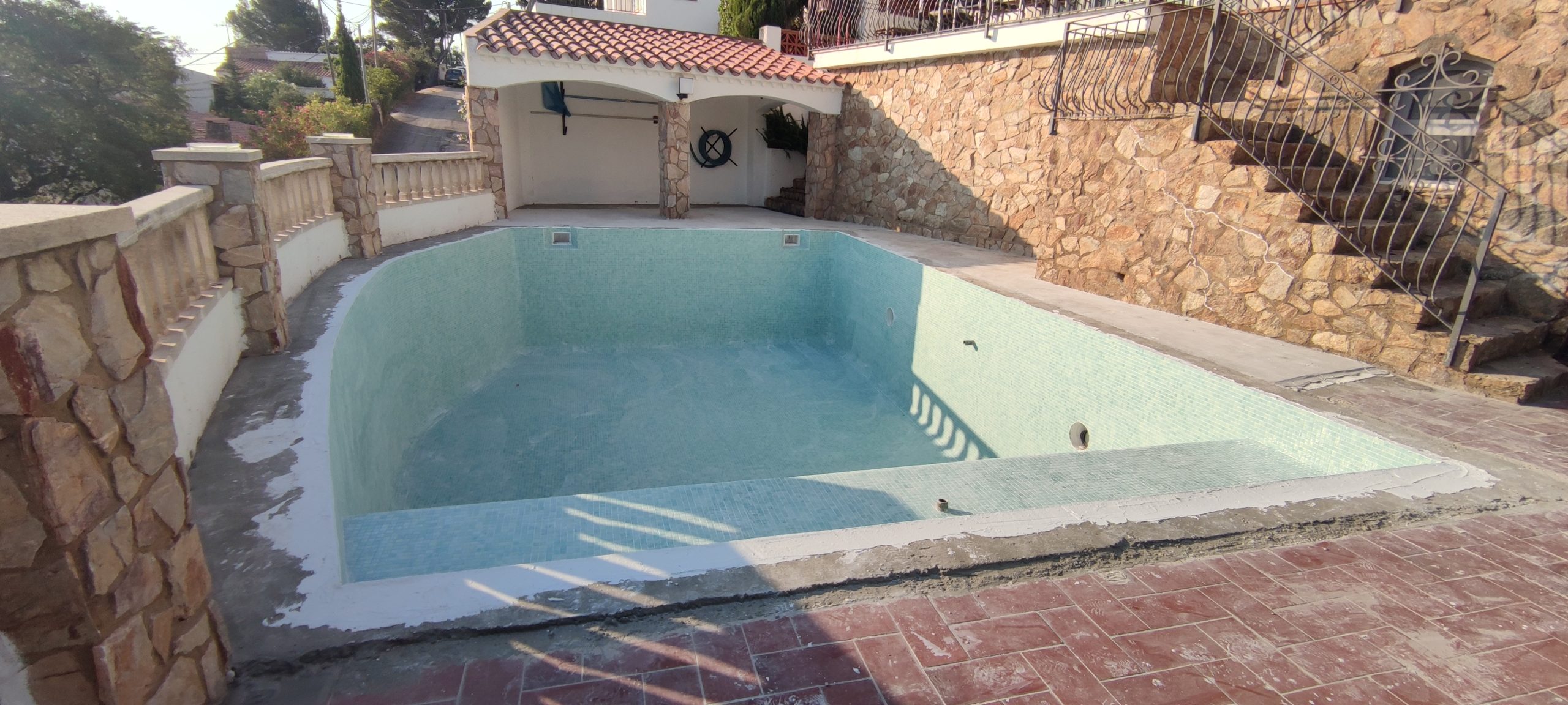 Piscina amb revestiment micromosaic vítric de la casa Squamers model Genuine 102 (peça de mides 25 x 25 mm). Escala de costat a costat i primer esglaó amb zona de platja. Coronació i terrassa amb gres porcelànic de la casa Mykonos Cerámics model Aspen Tierra (peça de 30 x 60 cms).
