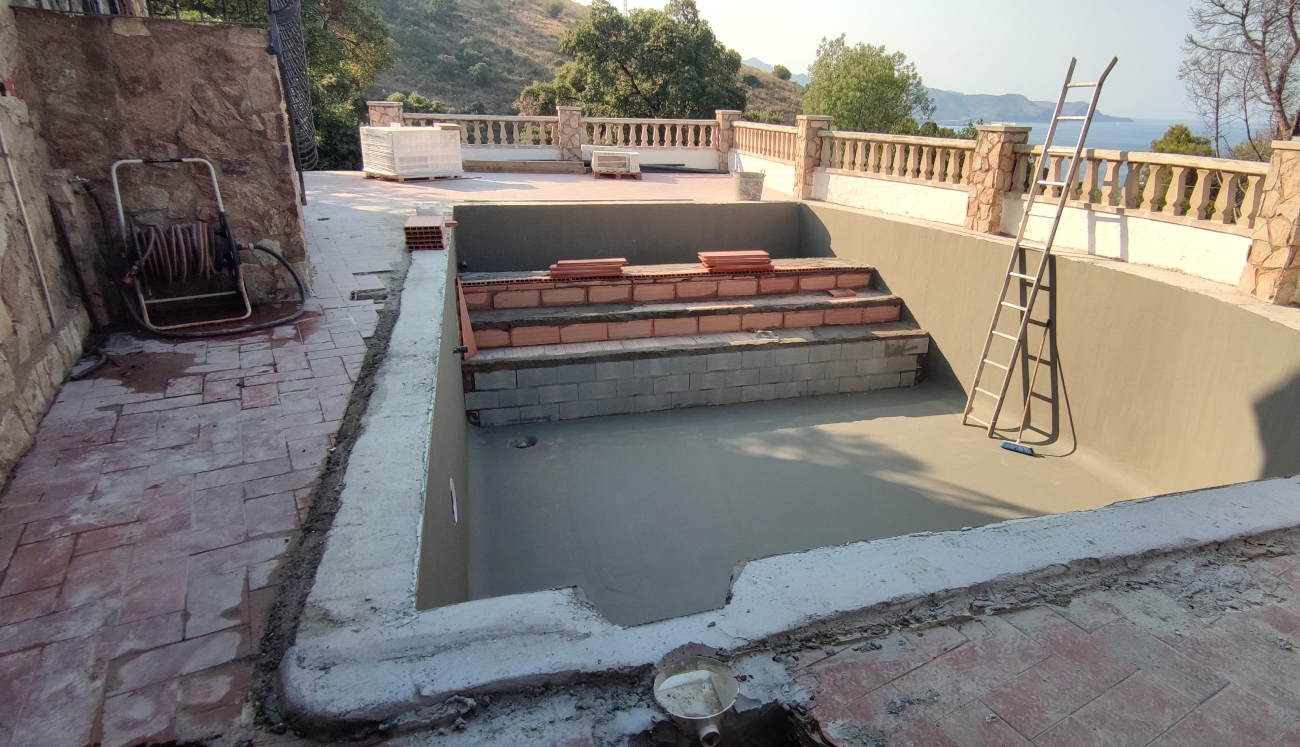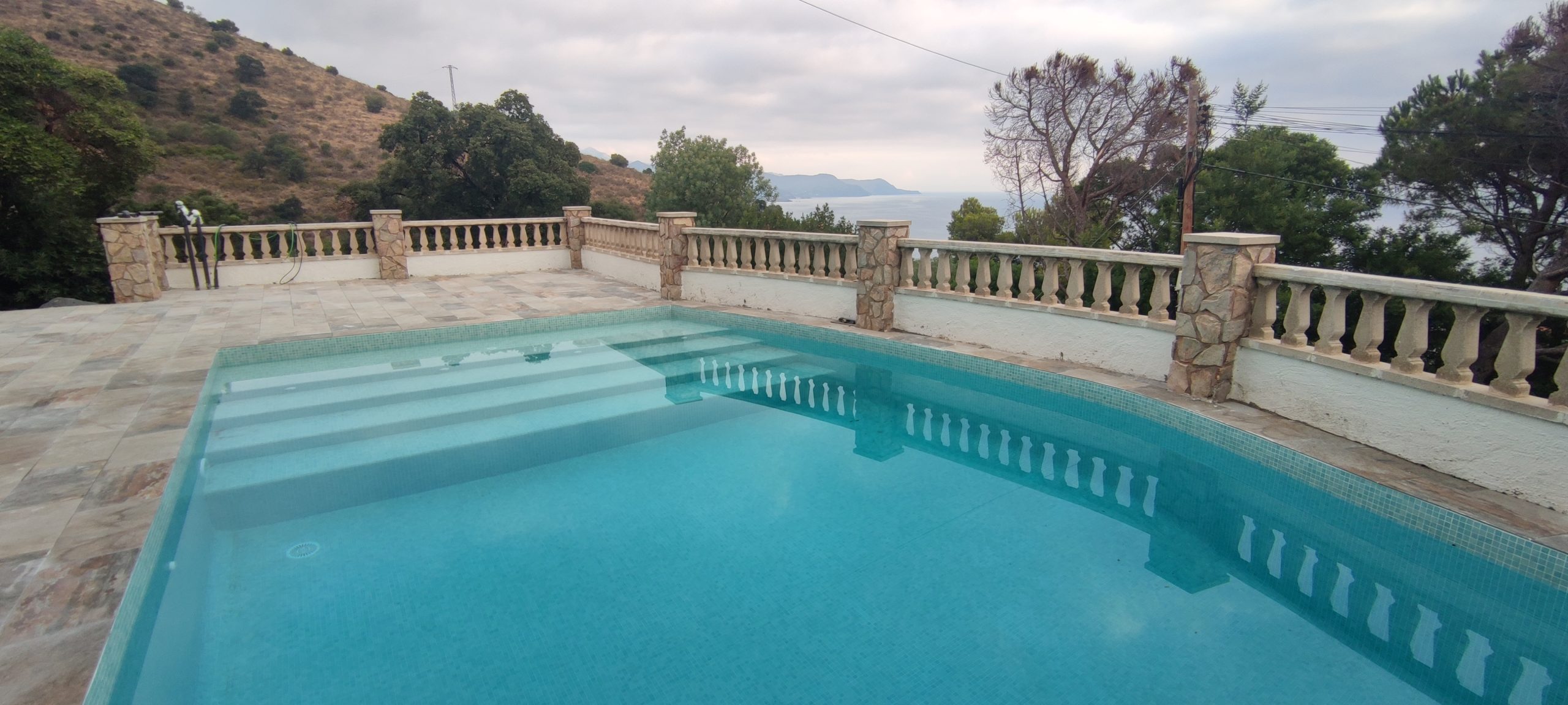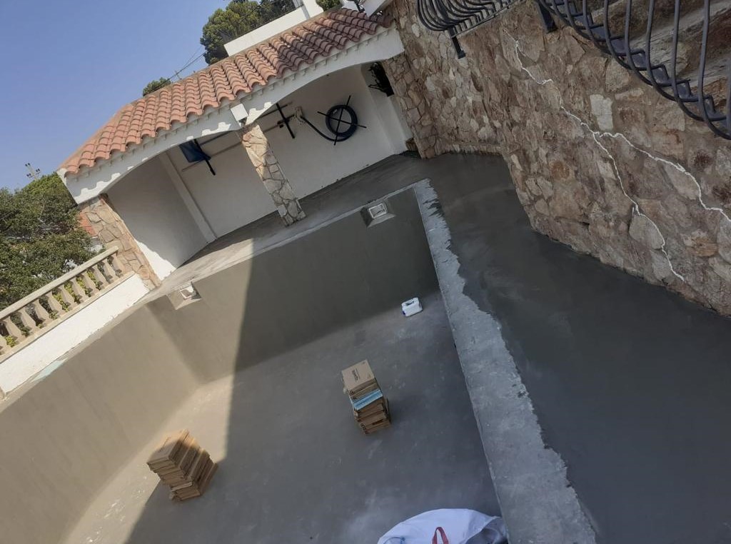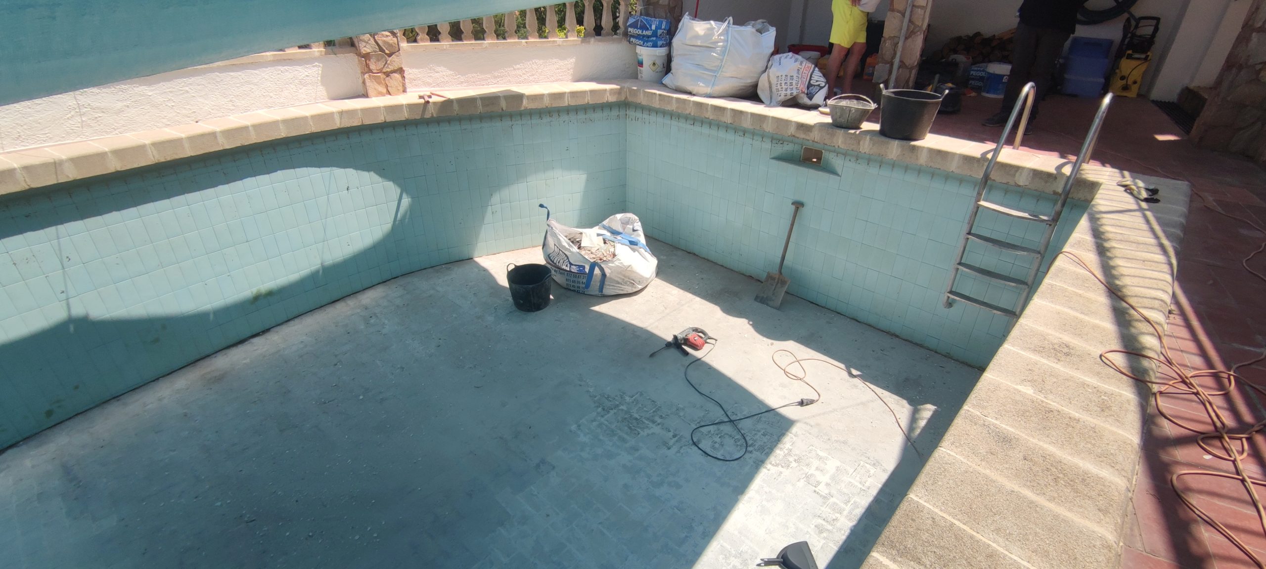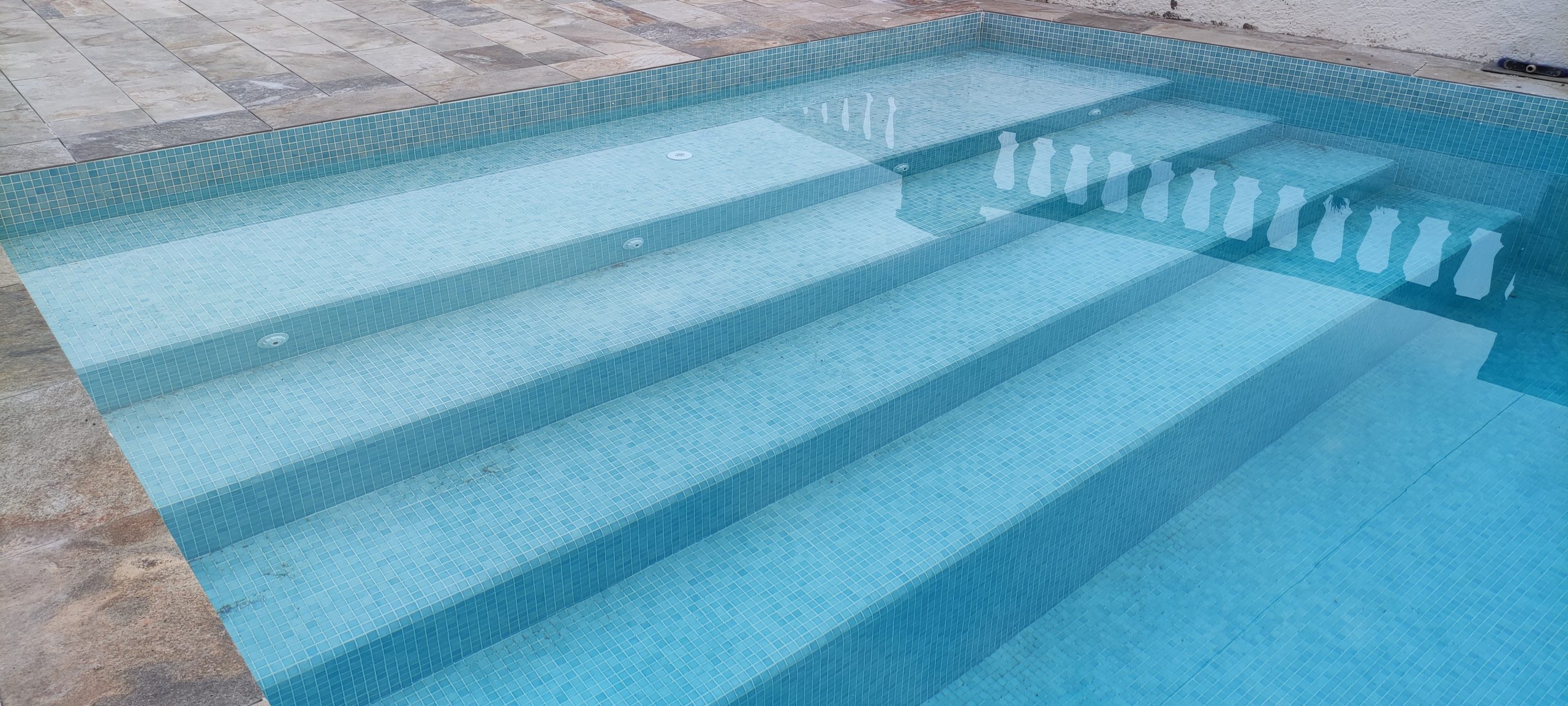 Piscina amb revestiment micromosaic vítric de la casa Squamers model Genuine 102 (peça de mides 25 x 25 mm). Escala de costat a costat i primer esglaó amb zona de platja. Coronació i terrassa amb gres porcelànic de la casa Mykonos Cerámics model Aspen Tierra (peça de 30 x 60 cms).