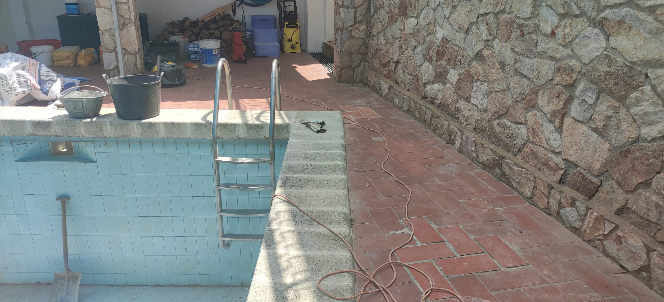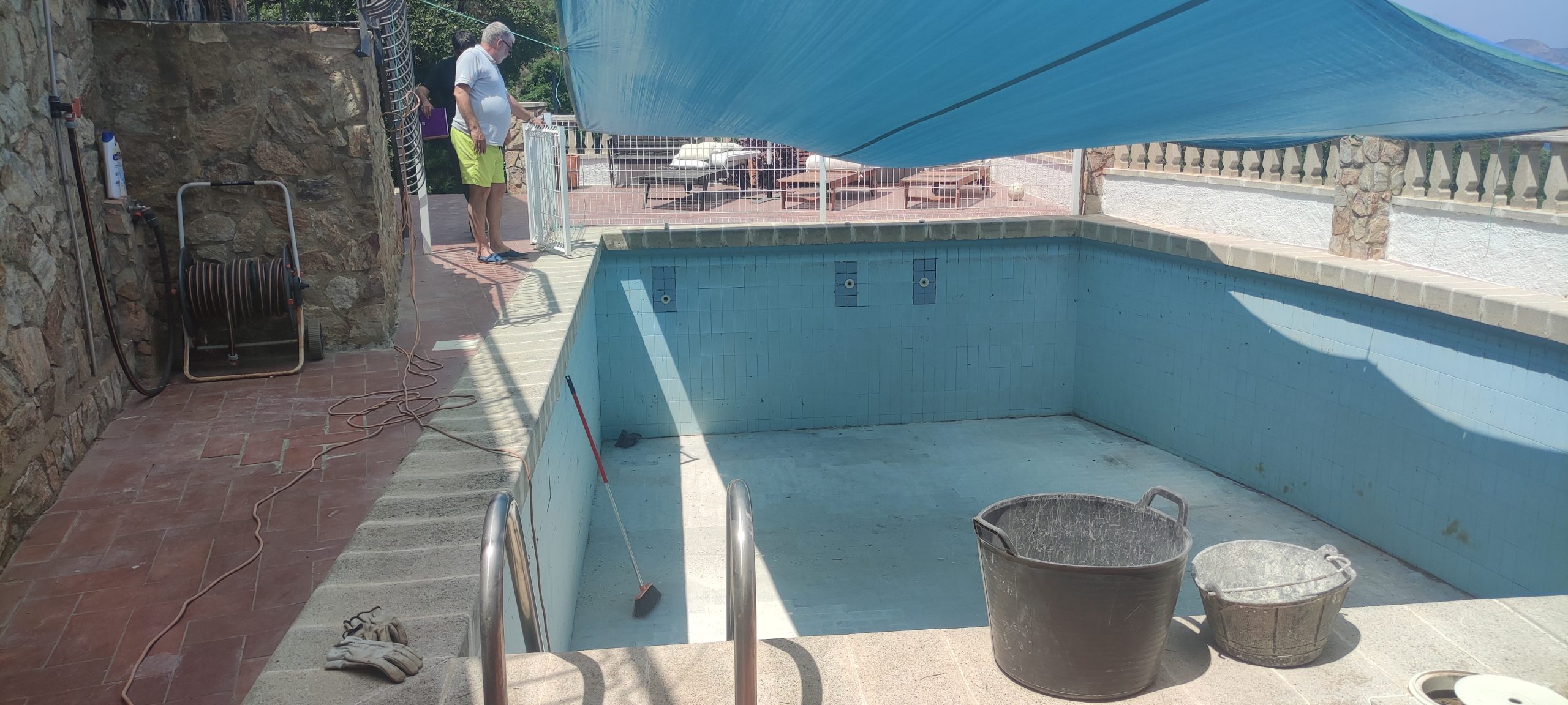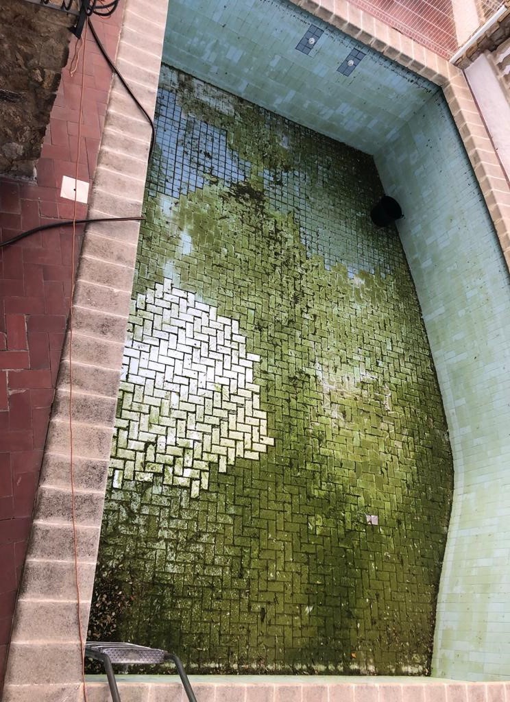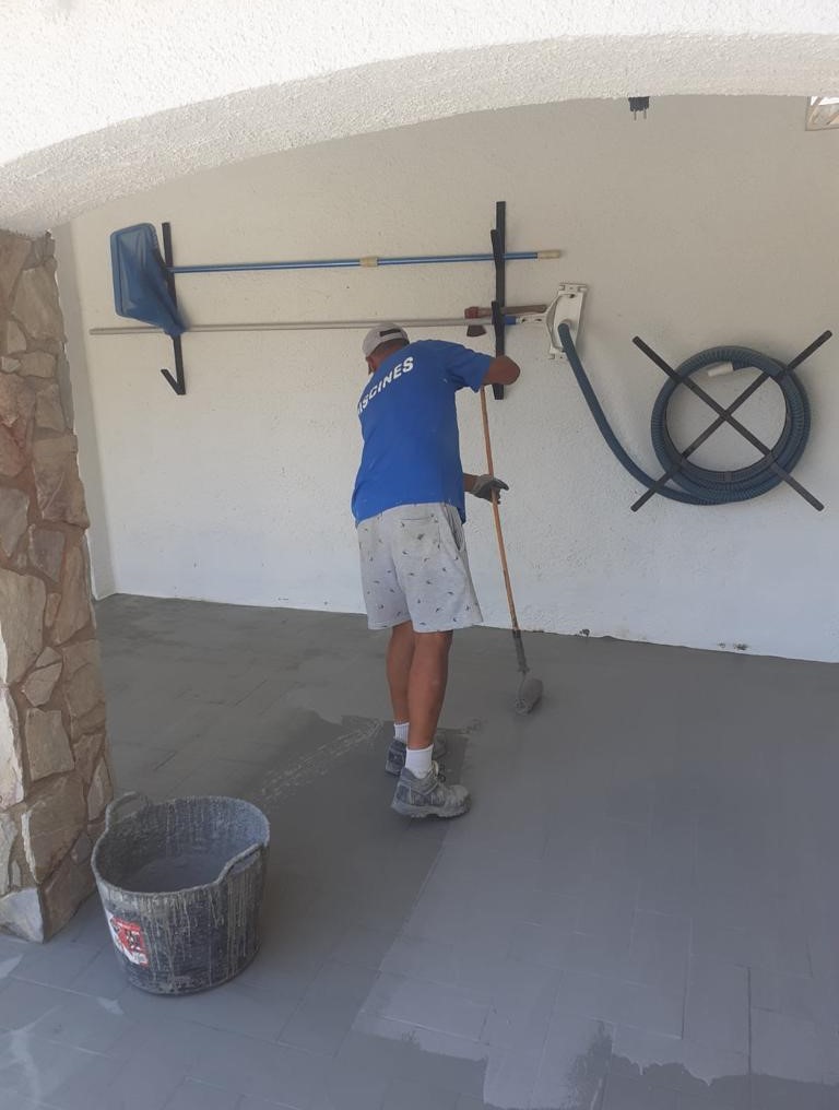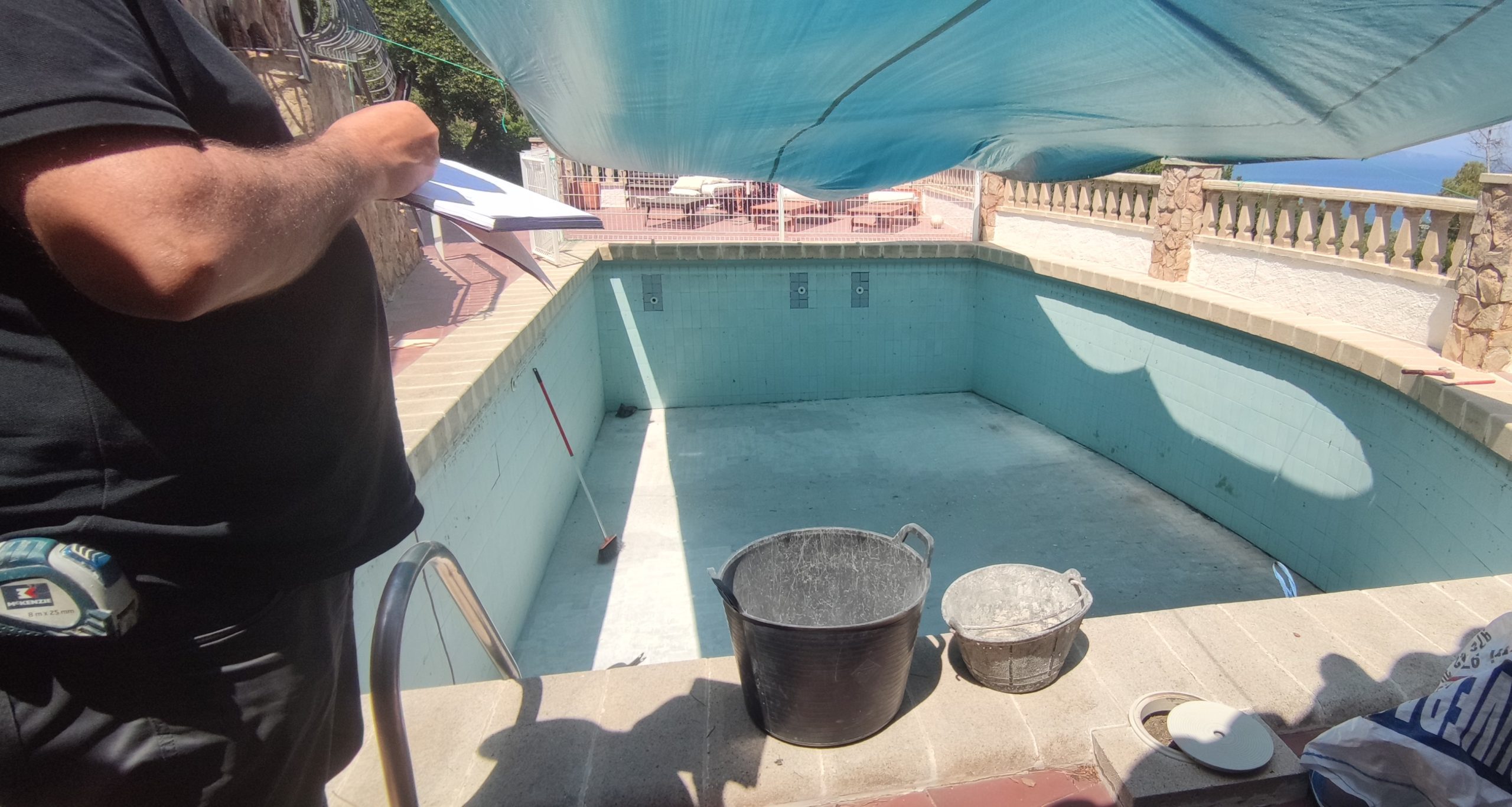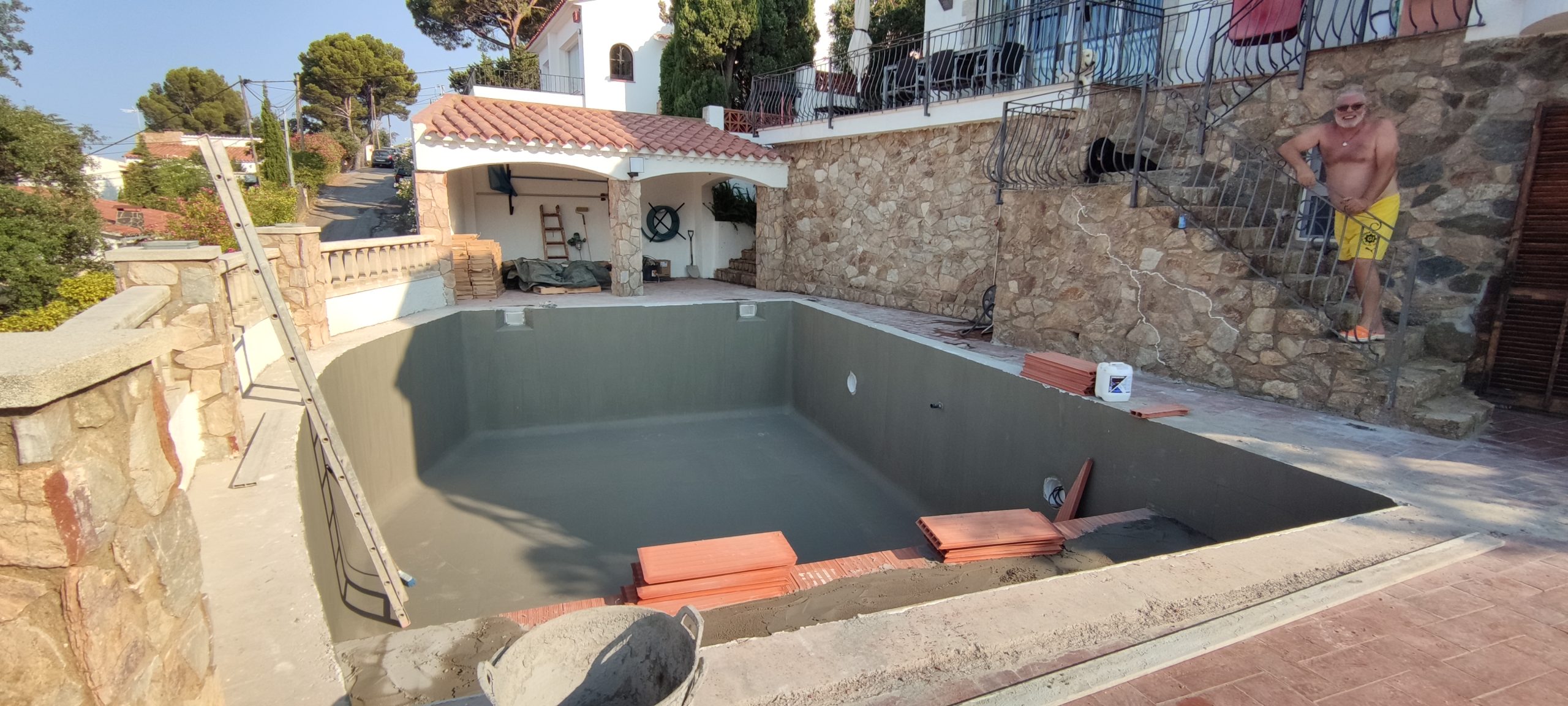 Piscina amb revestiment micromosaic vítric de la casa Squamers model Genuine 102 (peça de mides 25 x 25 mm). Escala de costat a costat i primer esglaó amb zona de platja. Coronació i terrassa amb gres porcelànic de la casa Mykonos Cerámics model Aspen Tierra (peça de 30 x 60 cms).