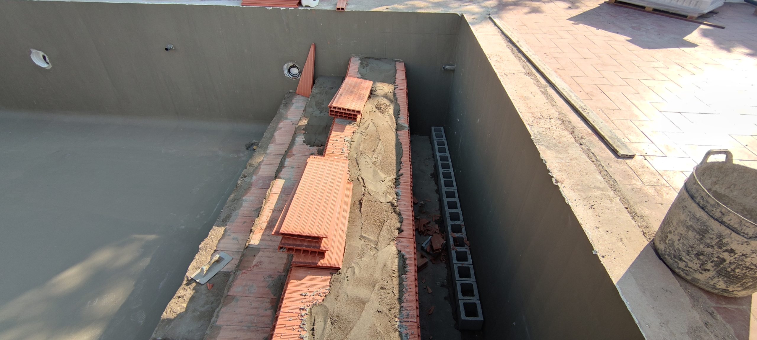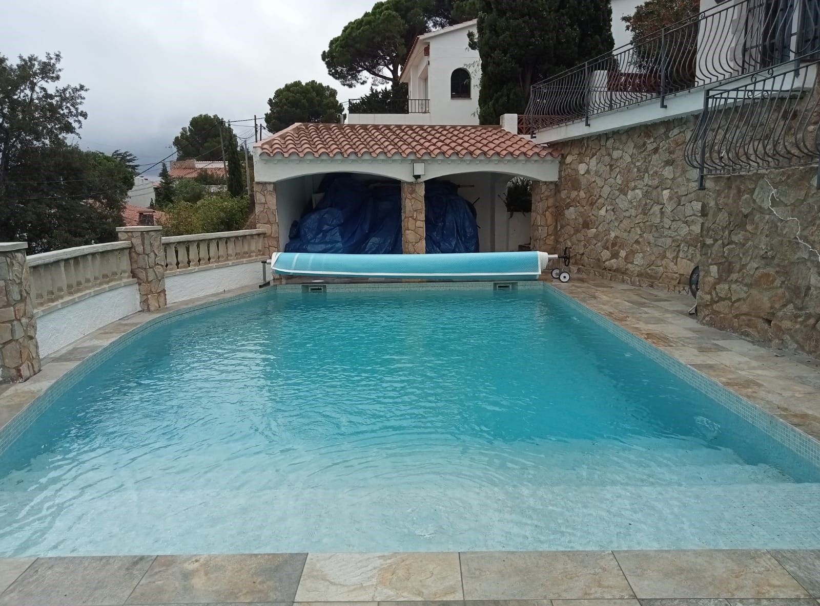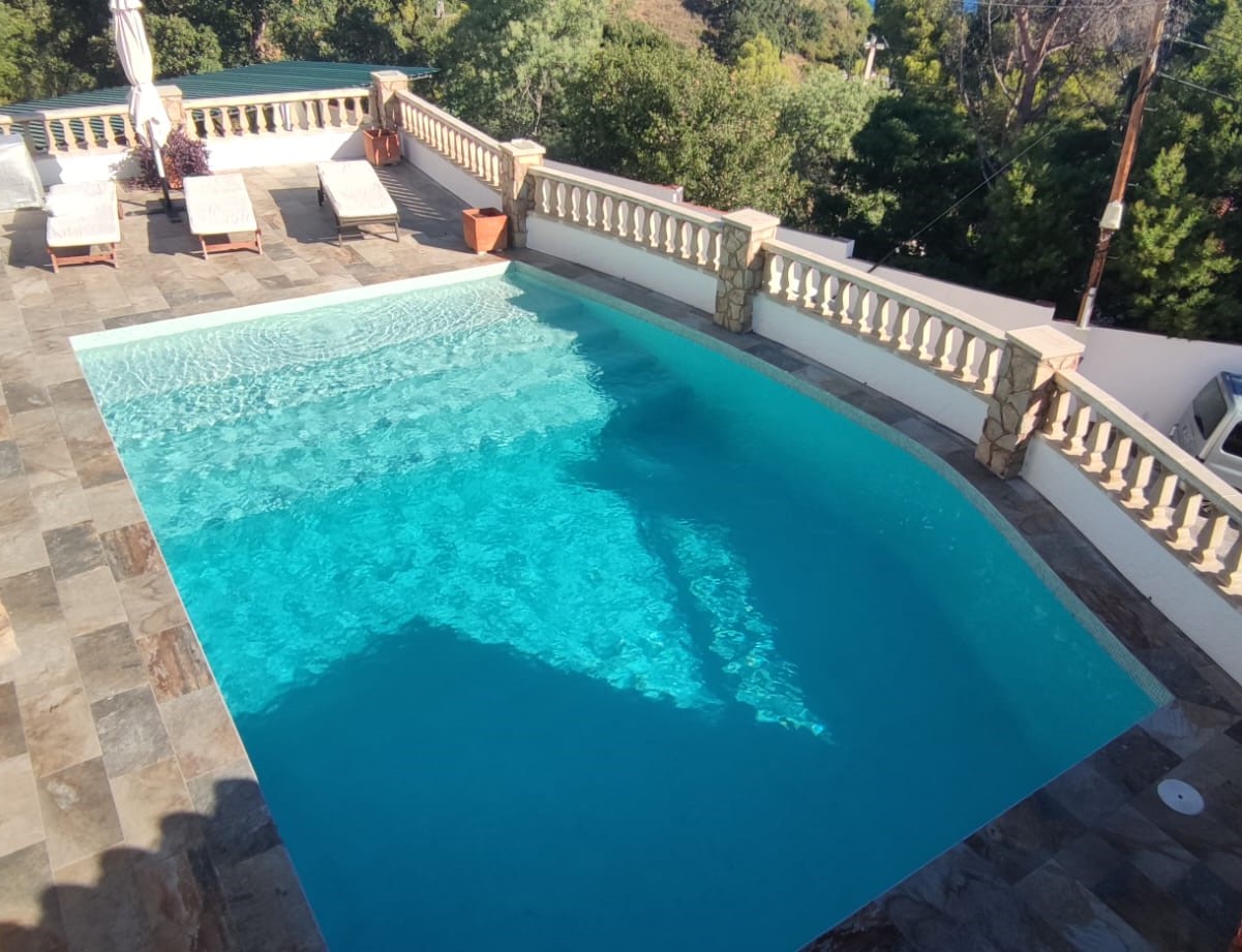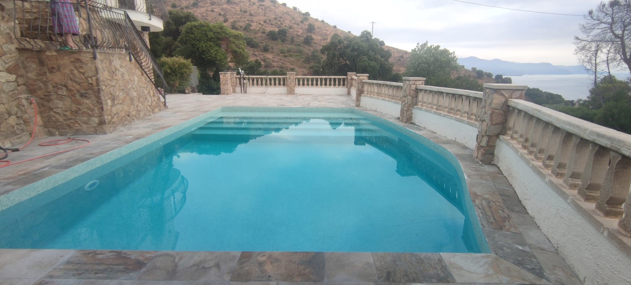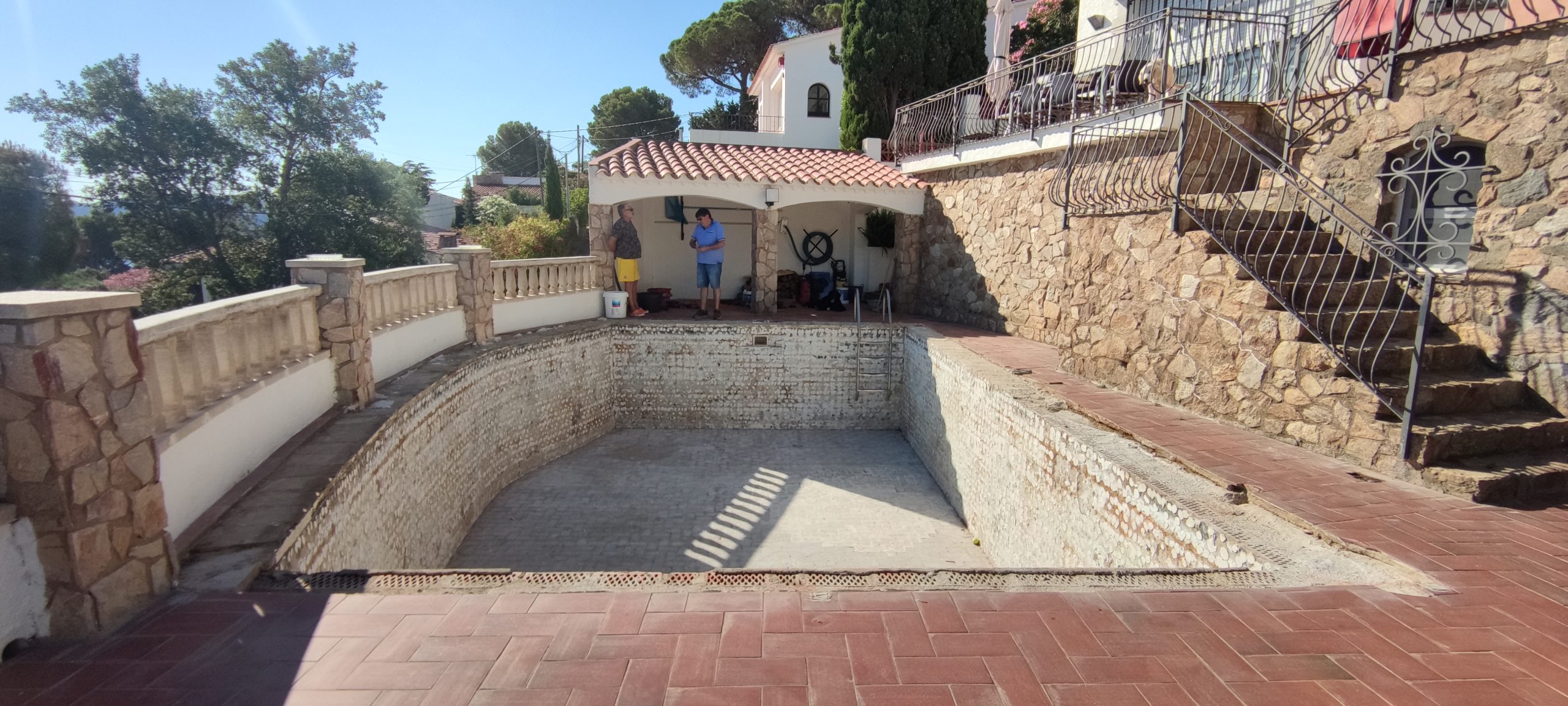 Piscina amb revestiment micromosaic vítric de la casa Squamers model Genuine 102 (peça de mides 25 x 25 mm). Escala de costat a costat i primer esglaó amb zona de platja. Coronació i terrassa amb gres porcelànic de la casa Mykonos Cerámics model Aspen Tierra (peça de 30 x 60 cms).