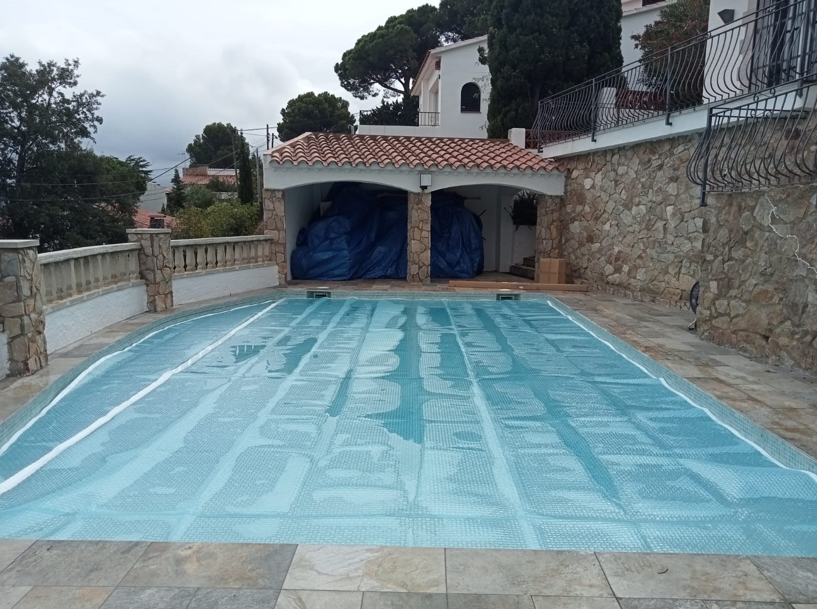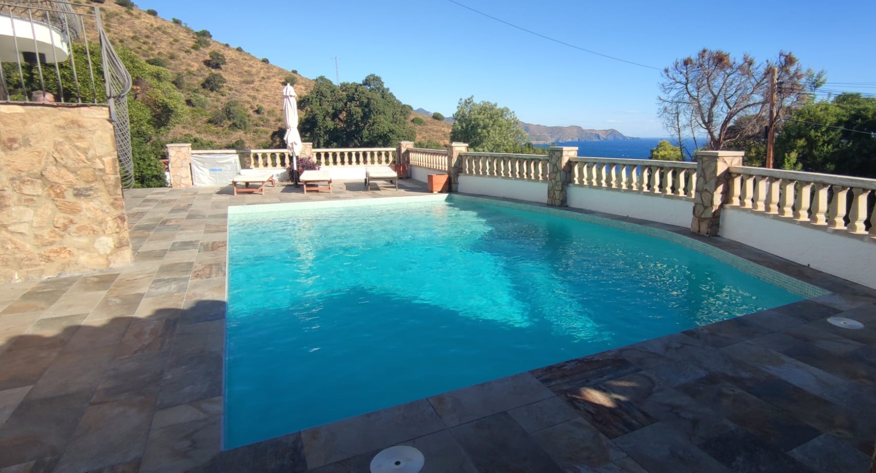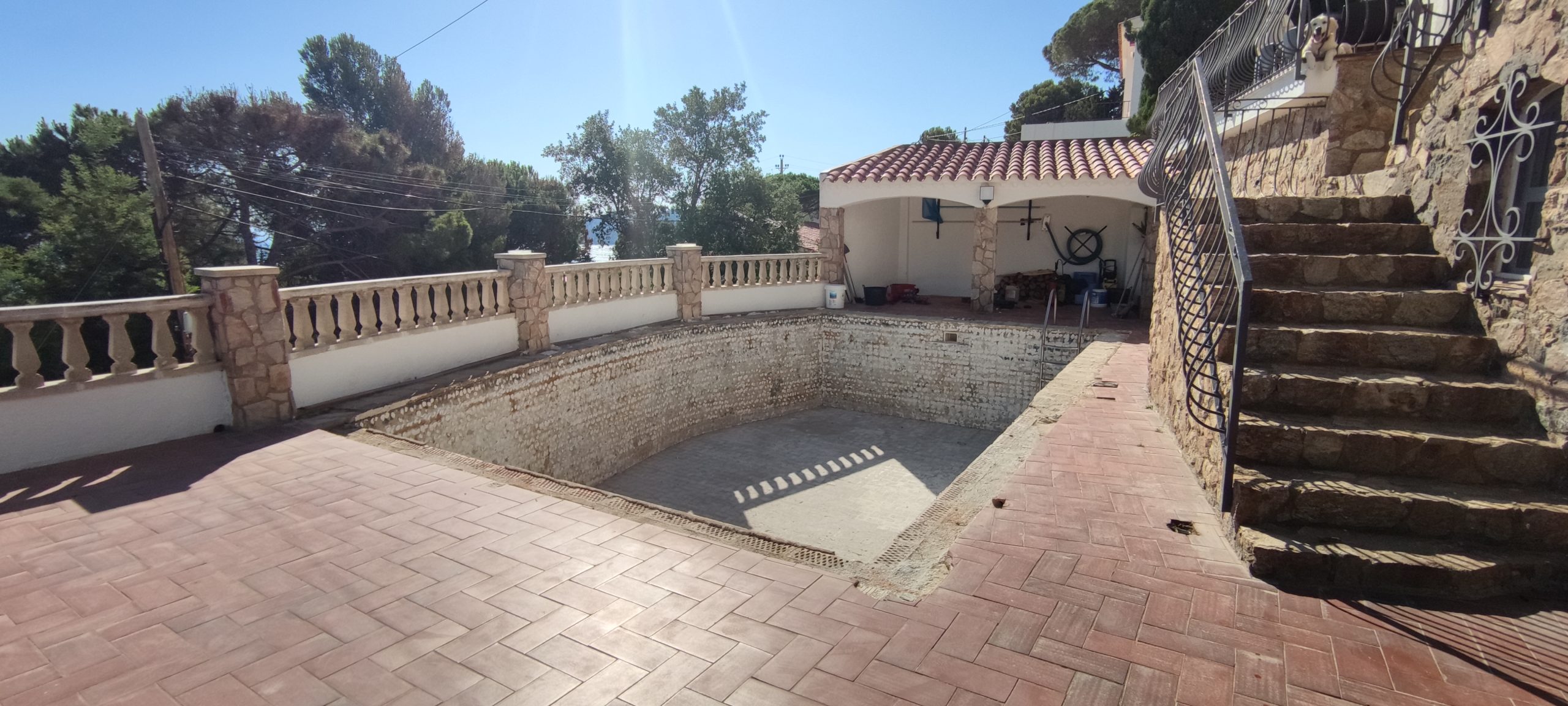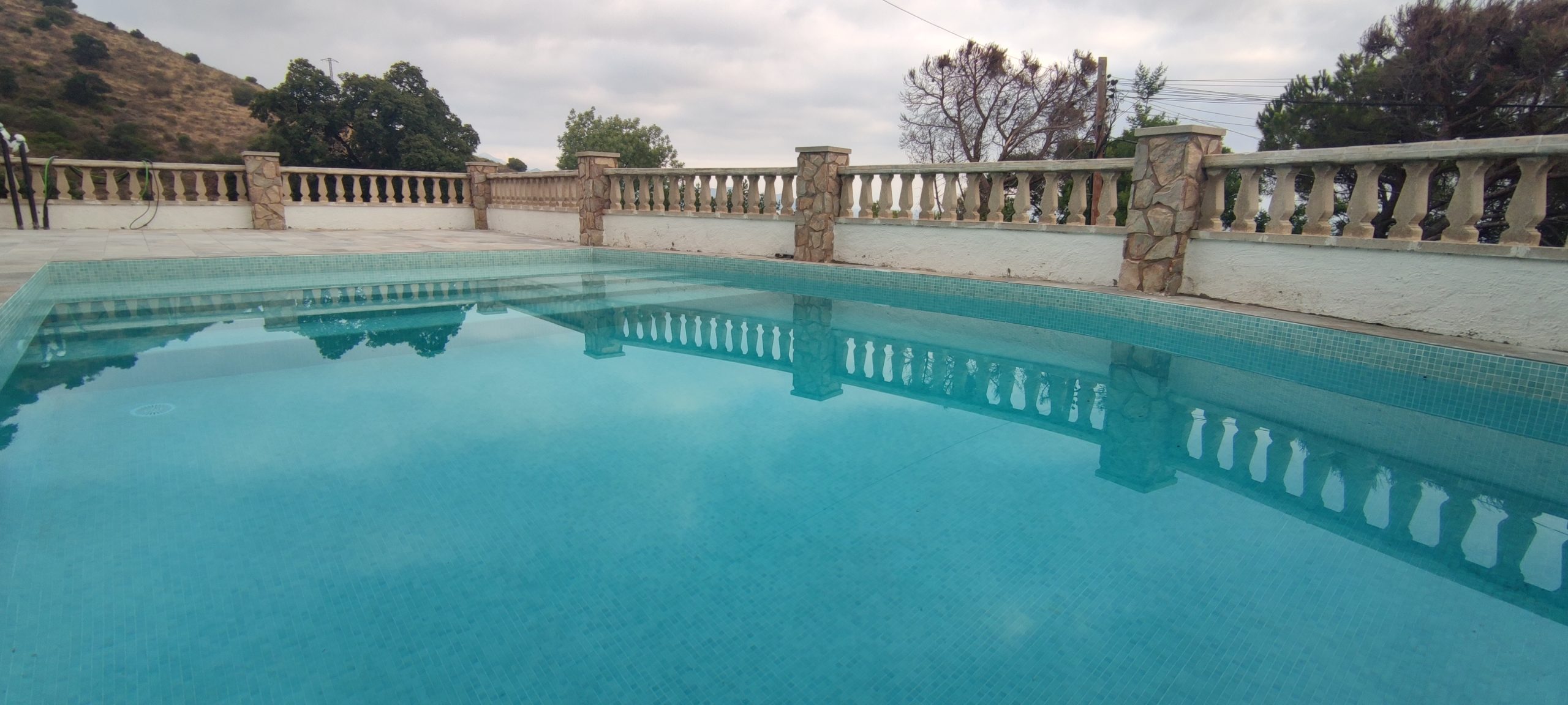 Piscina amb revestiment micromosaic vítric de la casa Squamers model Genuine 102 (peça de mides 25 x 25 mm). Escala de costat a costat i primer esglaó amb zona de platja. Coronació i terrassa amb gres porcelànic de la casa Mykonos Cerámics model Aspen Tierra (peça de 30 x 60 cms).