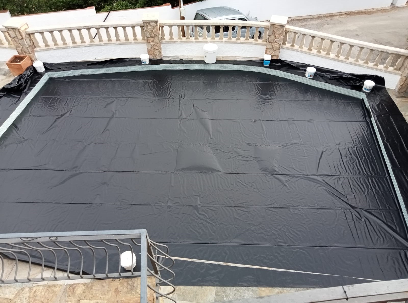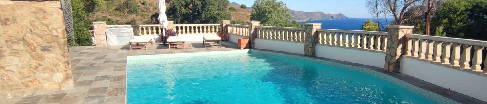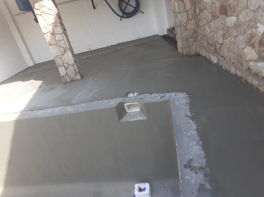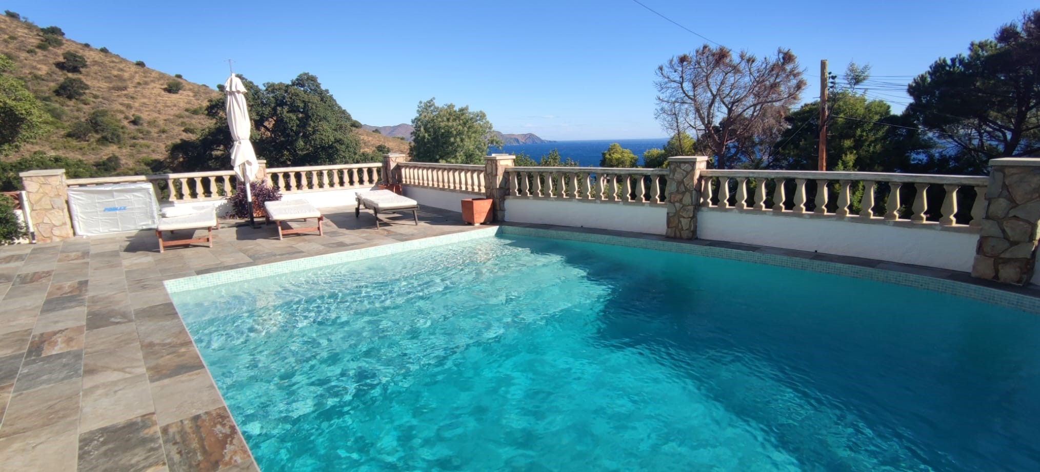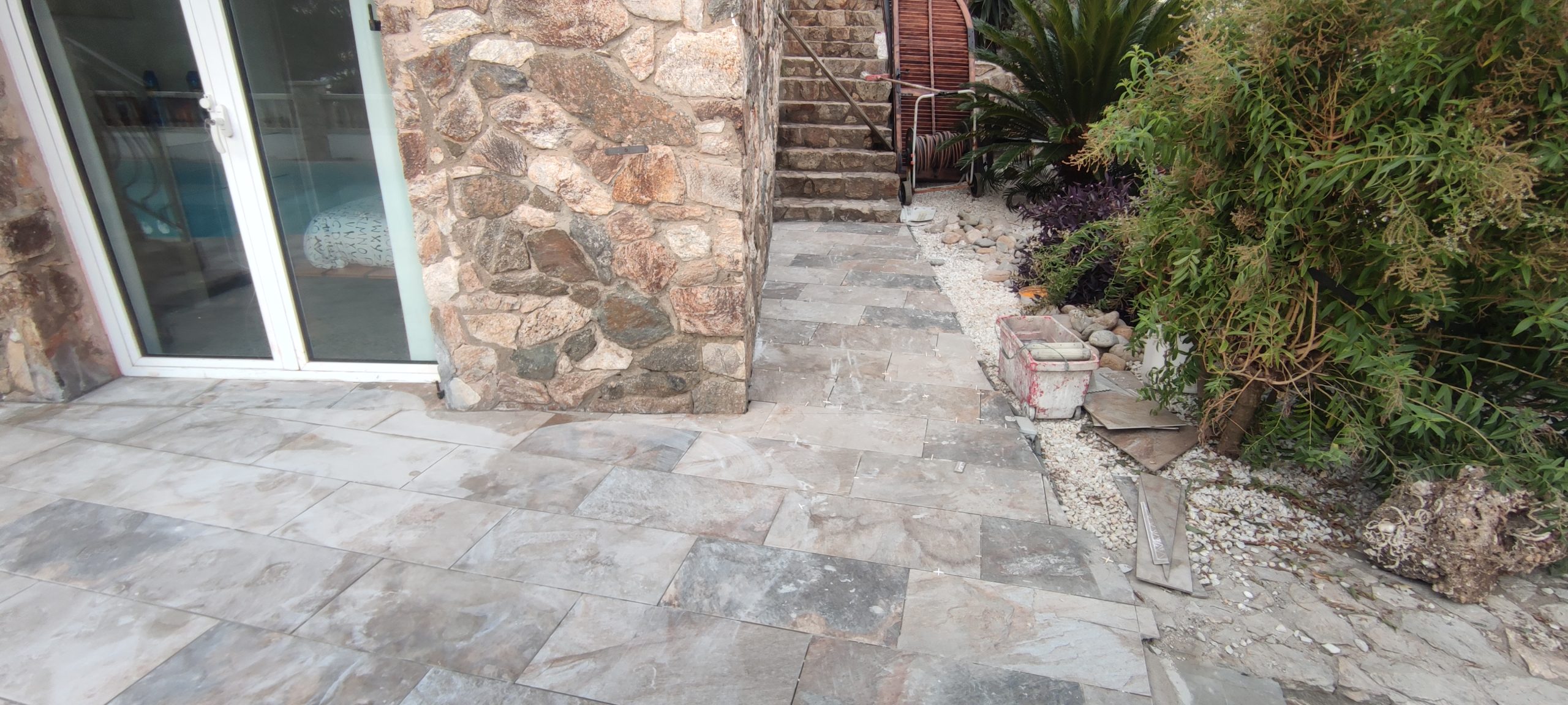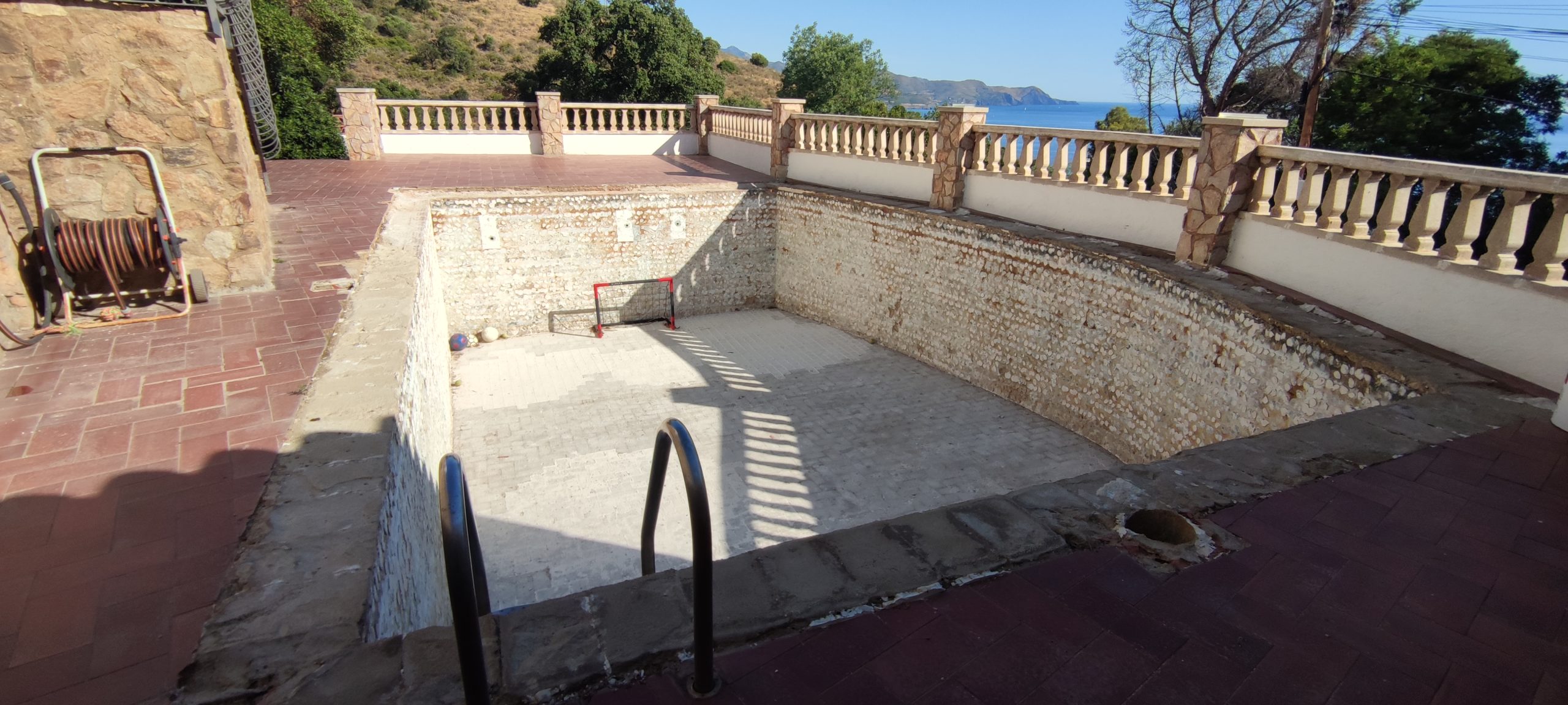 Piscina amb revestiment micromosaic vítric de la casa Squamers model Genuine 102 (peça de mides 25 x 25 mm). Escala de costat a costat i primer esglaó amb zona de platja. Coronació i terrassa amb gres porcelànic de la casa Mykonos Cerámics model Aspen Tierra (peça de 30 x 60 cms).