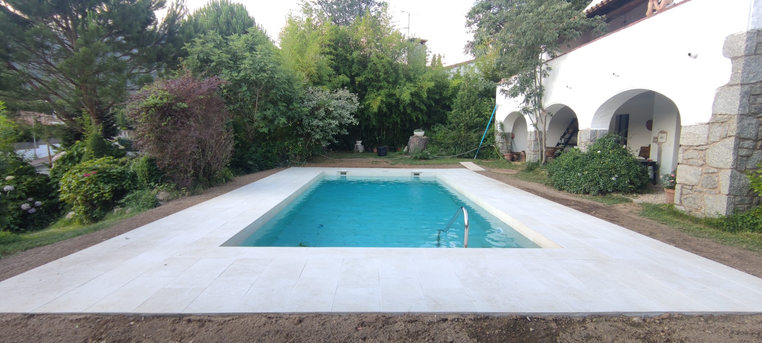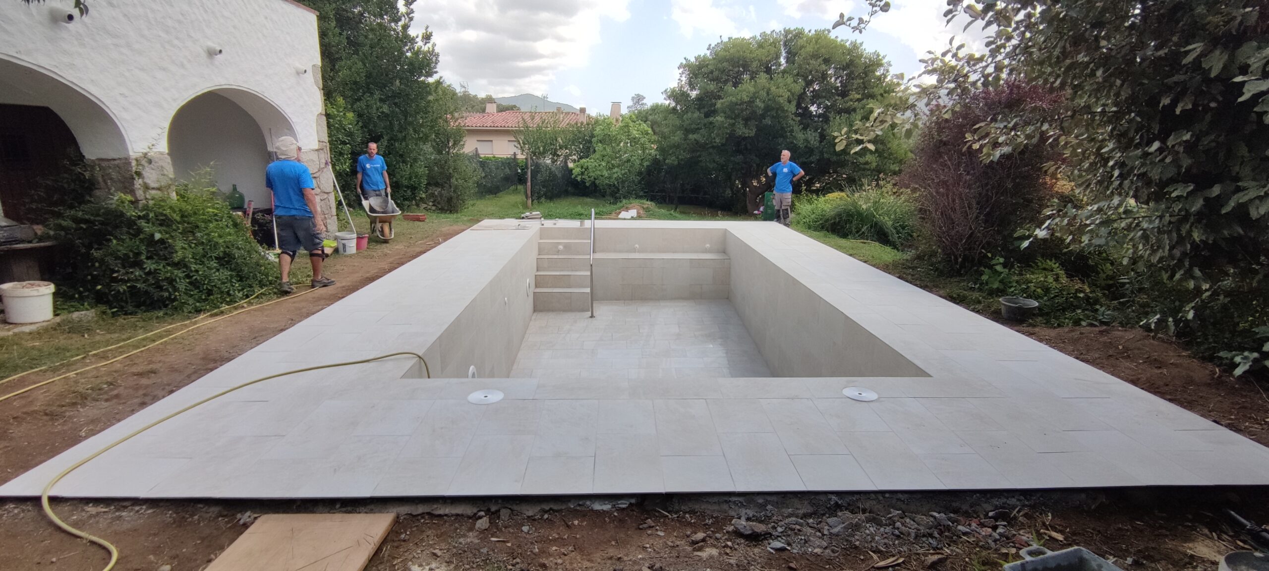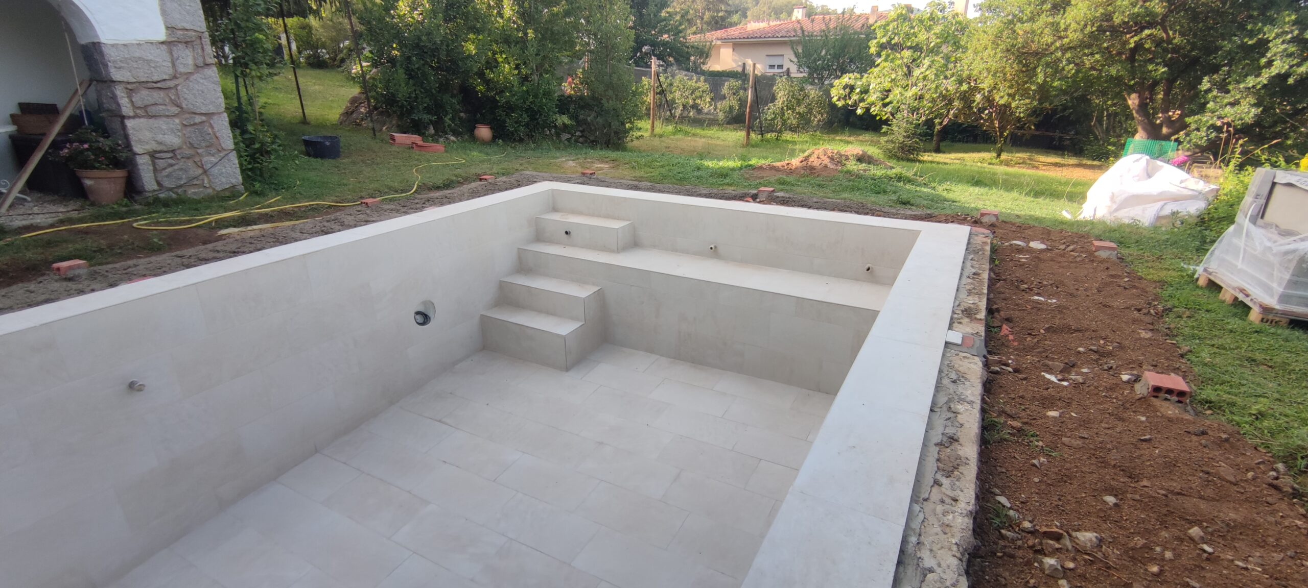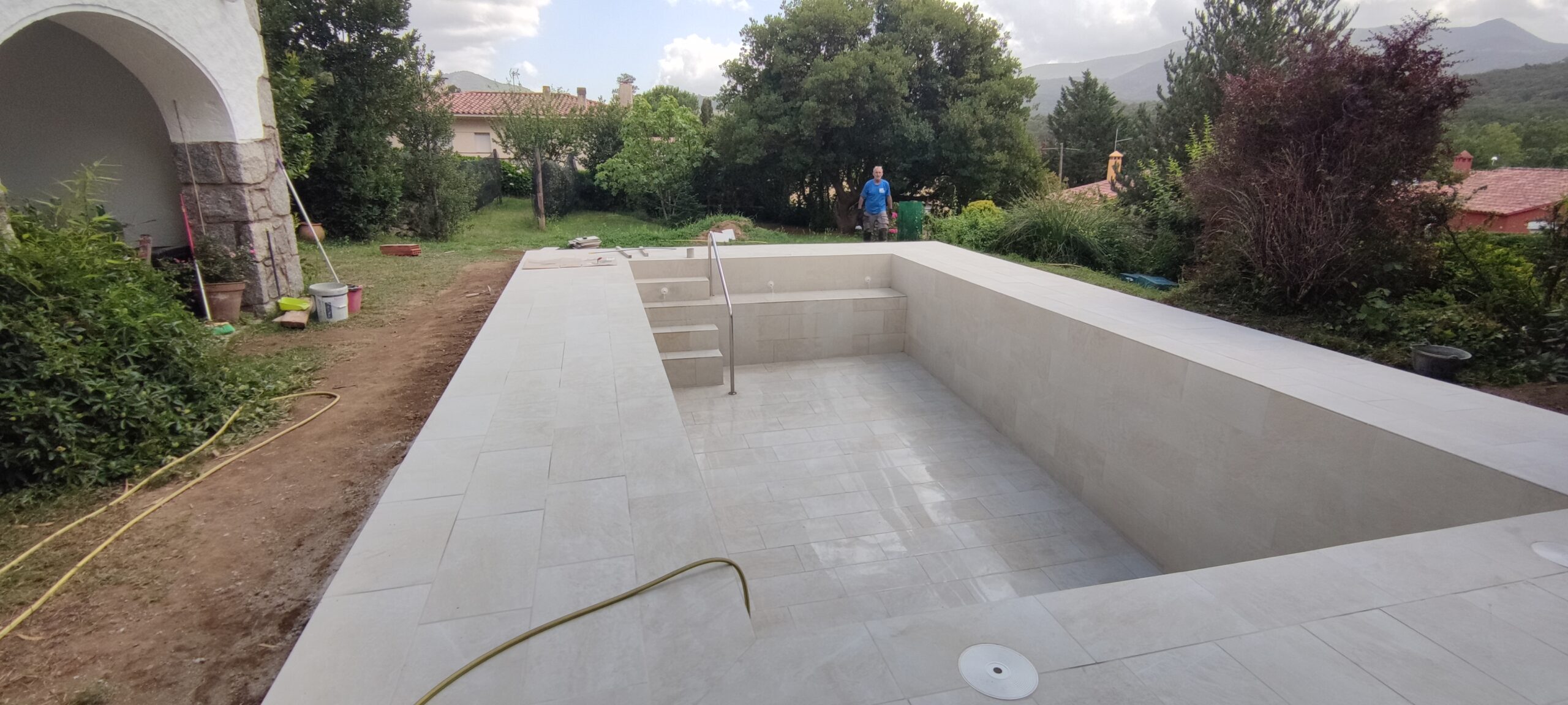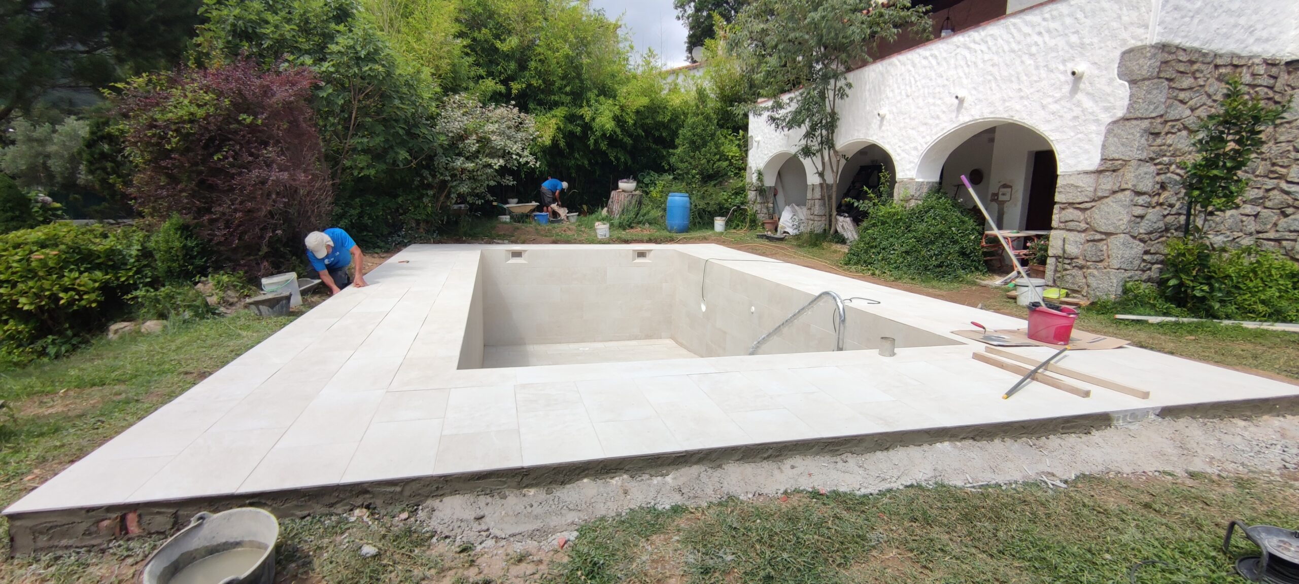 Piscina d’obra nova construida dins una piscina existent de polièster, amb revestiment gres porcelànic del fabricant Cerámica Mayor model Crosscut Petra Out (peça de mides 37,5 x 75 cms). Coronació i terrassa amb gres porcelànic de la mateixa marca.