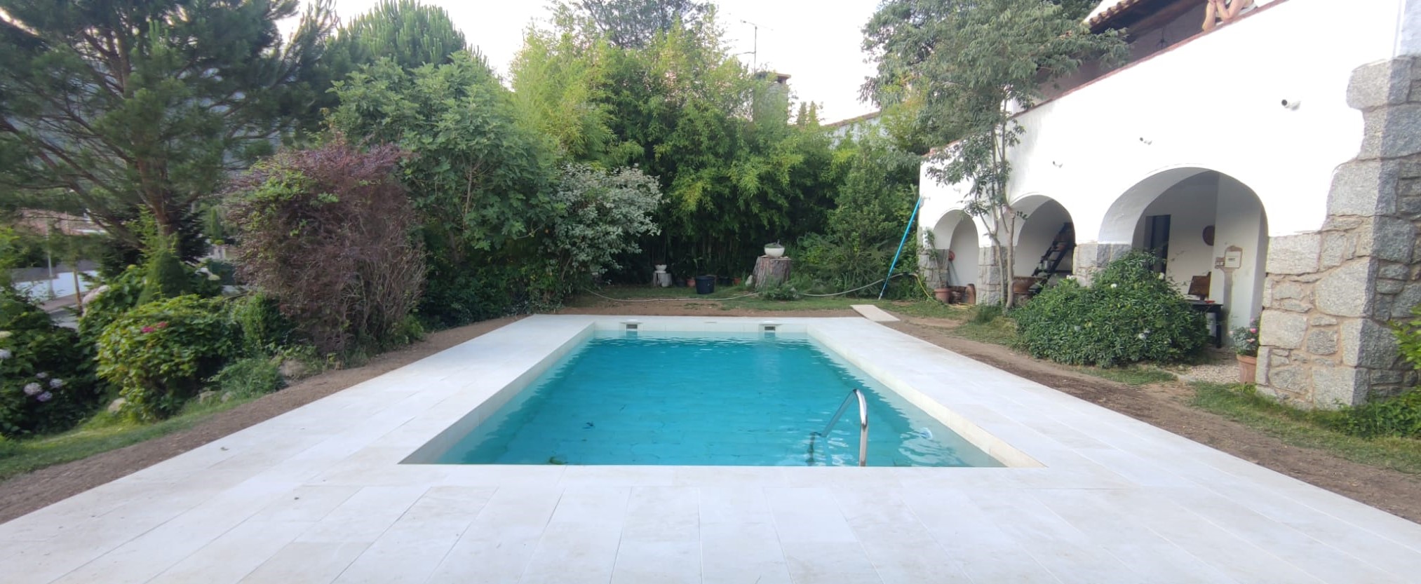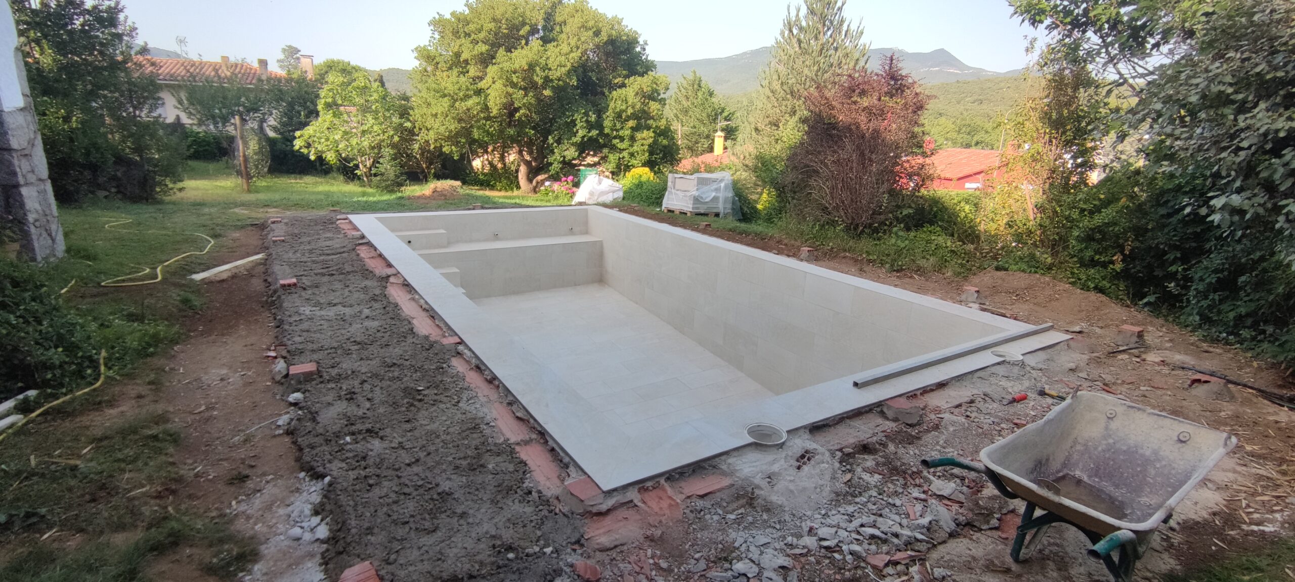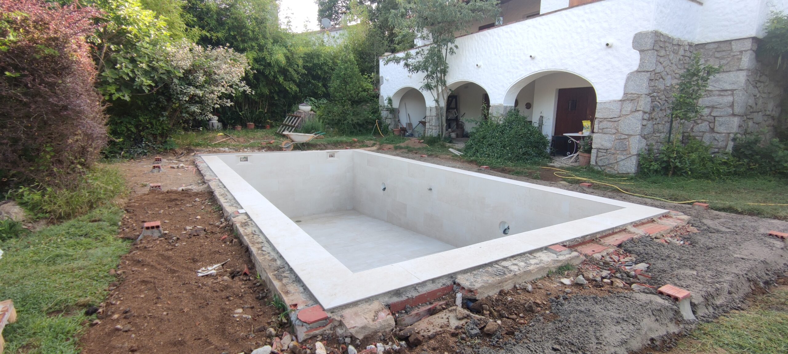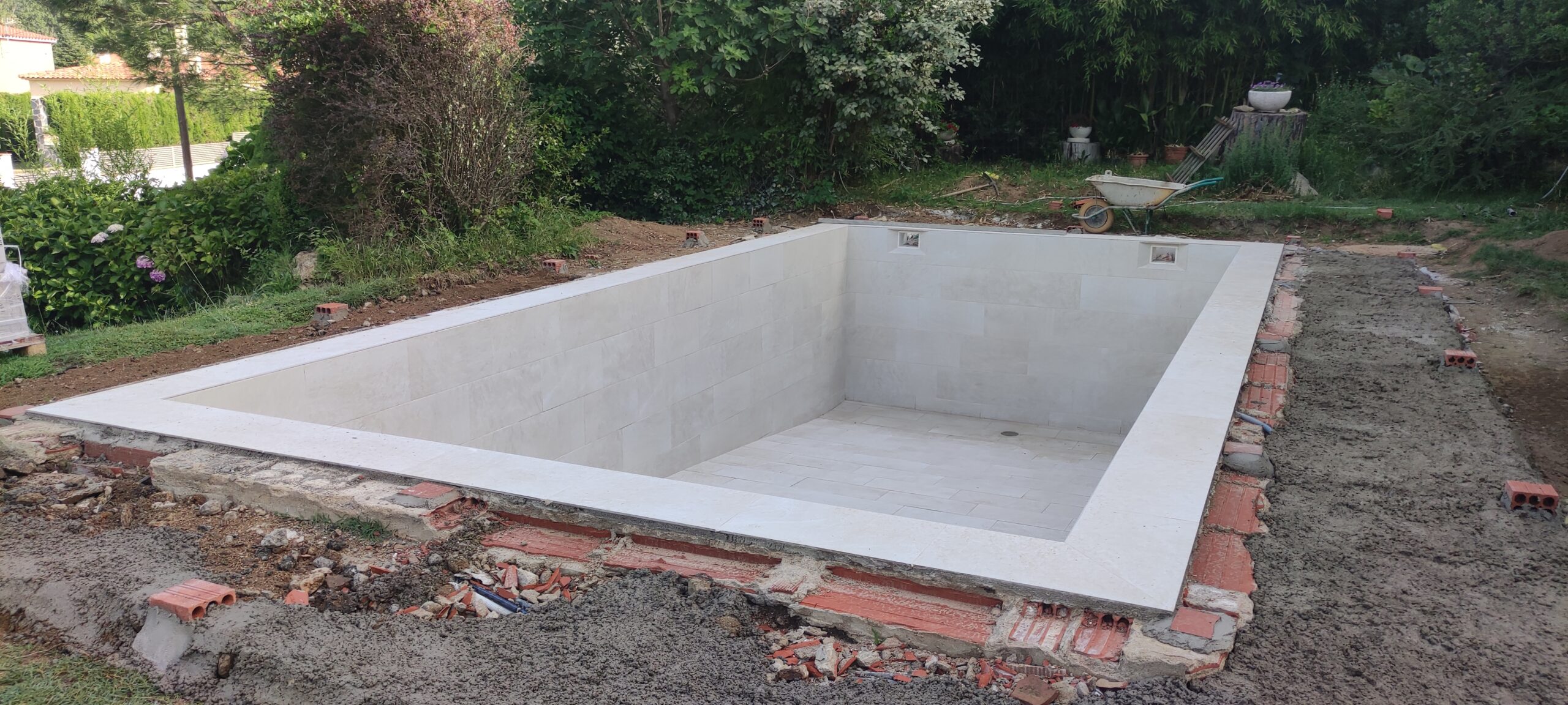 Piscina d’obra nova construida dins una piscina existent de polièster, amb revestiment gres porcelànic del fabricant Cerámica Mayor model Crosscut Petra Out (peça de mides 37,5 x 75 cms). Coronació i terrassa amb gres porcelànic de la mateixa marca.