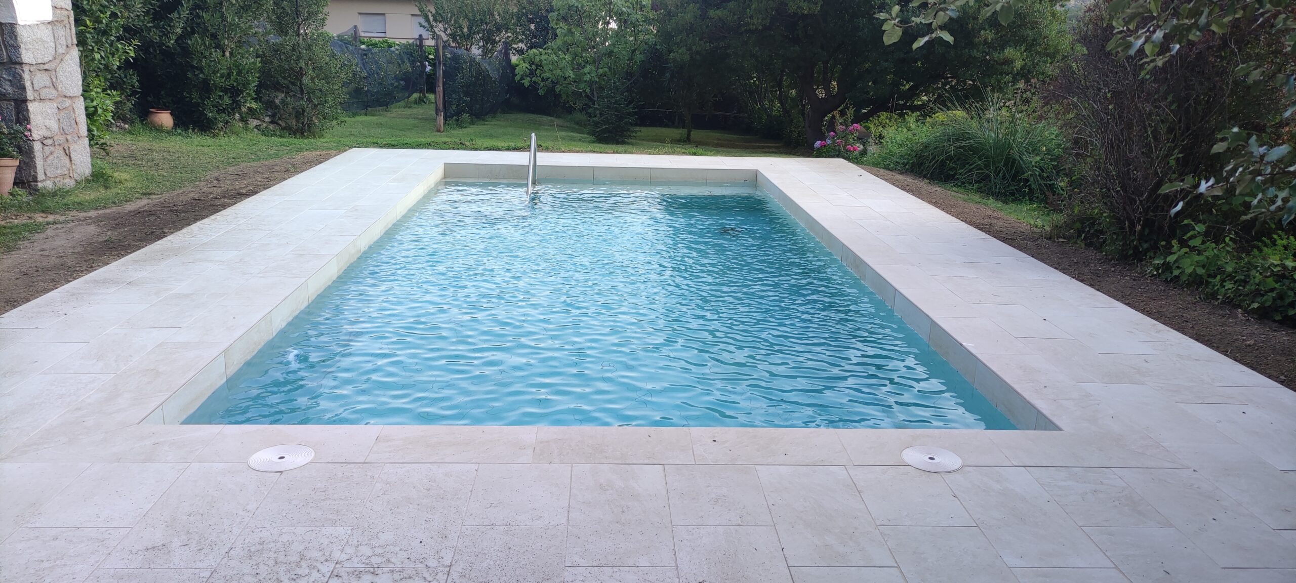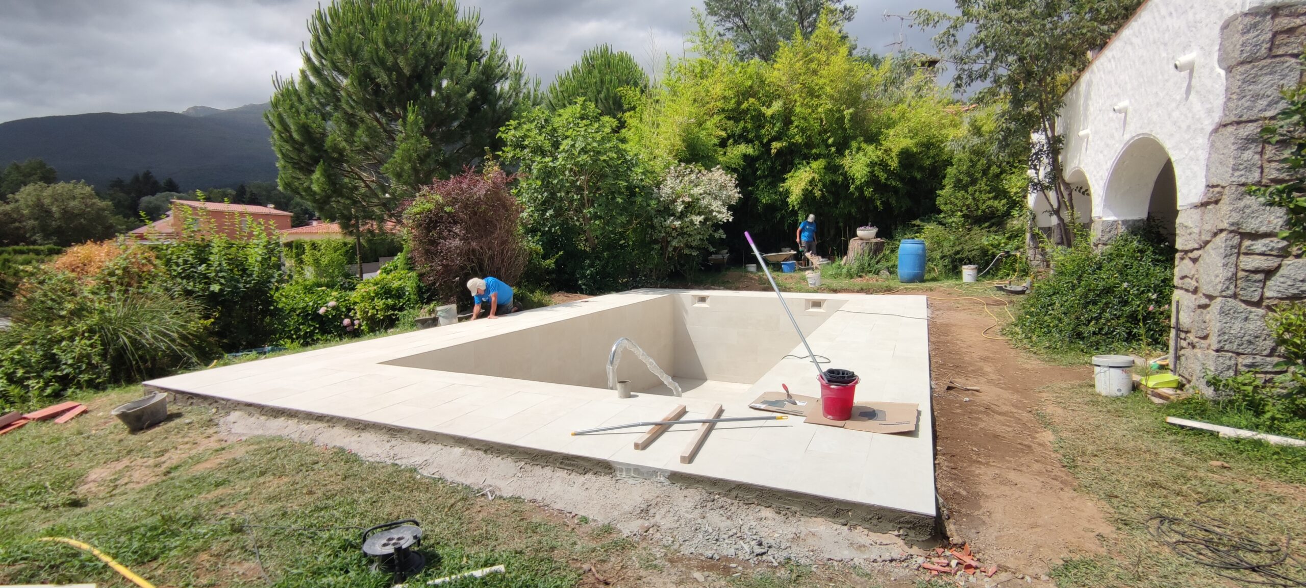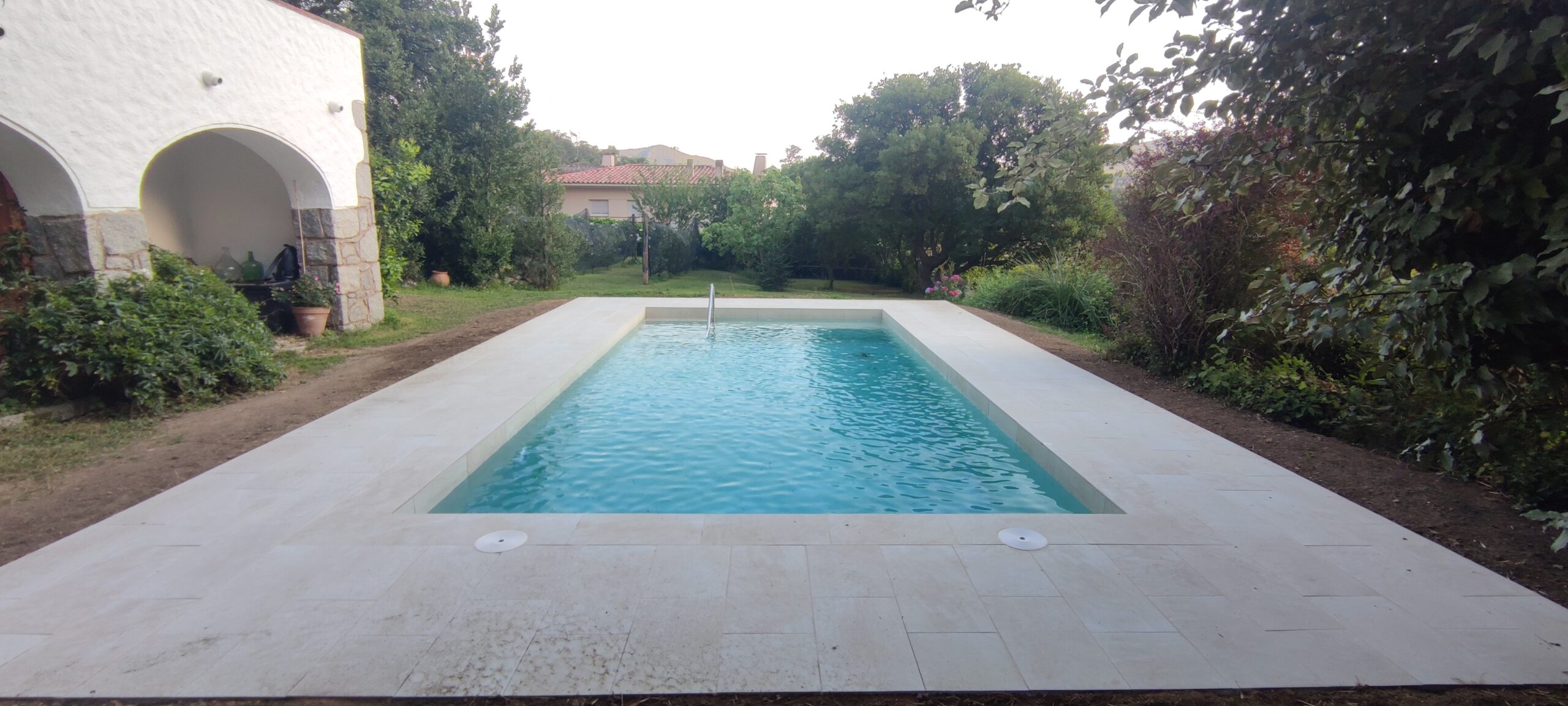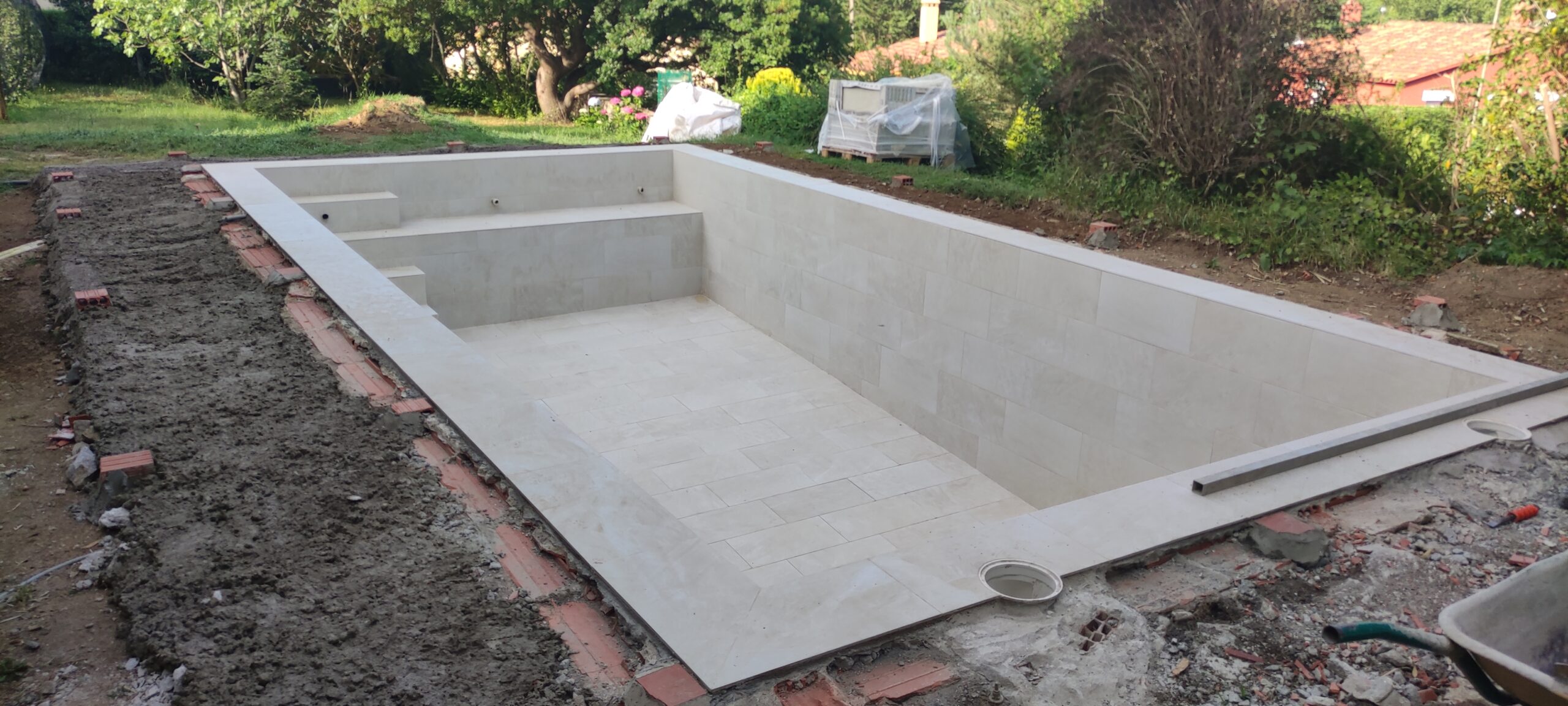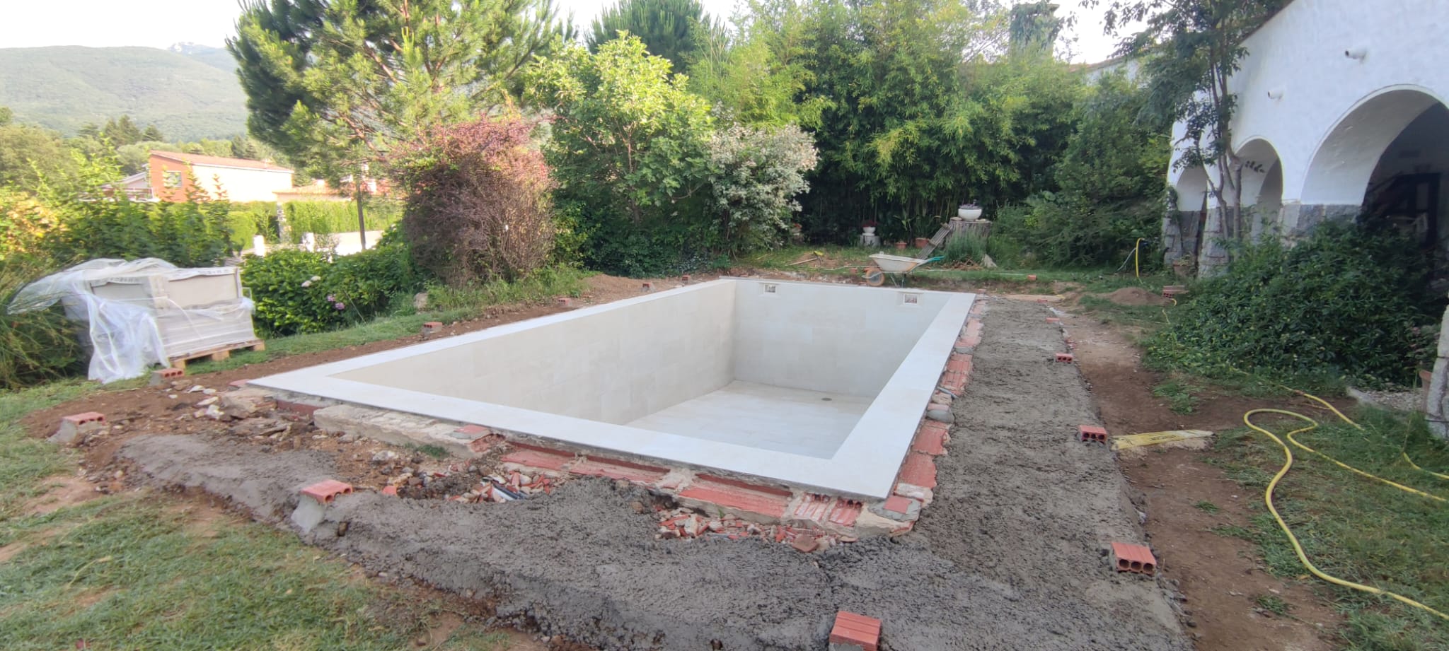 Piscina d’obra nova construida dins una piscina existent de polièster, amb revestiment gres porcelànic del fabricant Cerámica Mayor model Crosscut Petra Out (peça de mides 37,5 x 75 cms). Coronació i terrassa amb gres porcelànic de la mateixa marca.