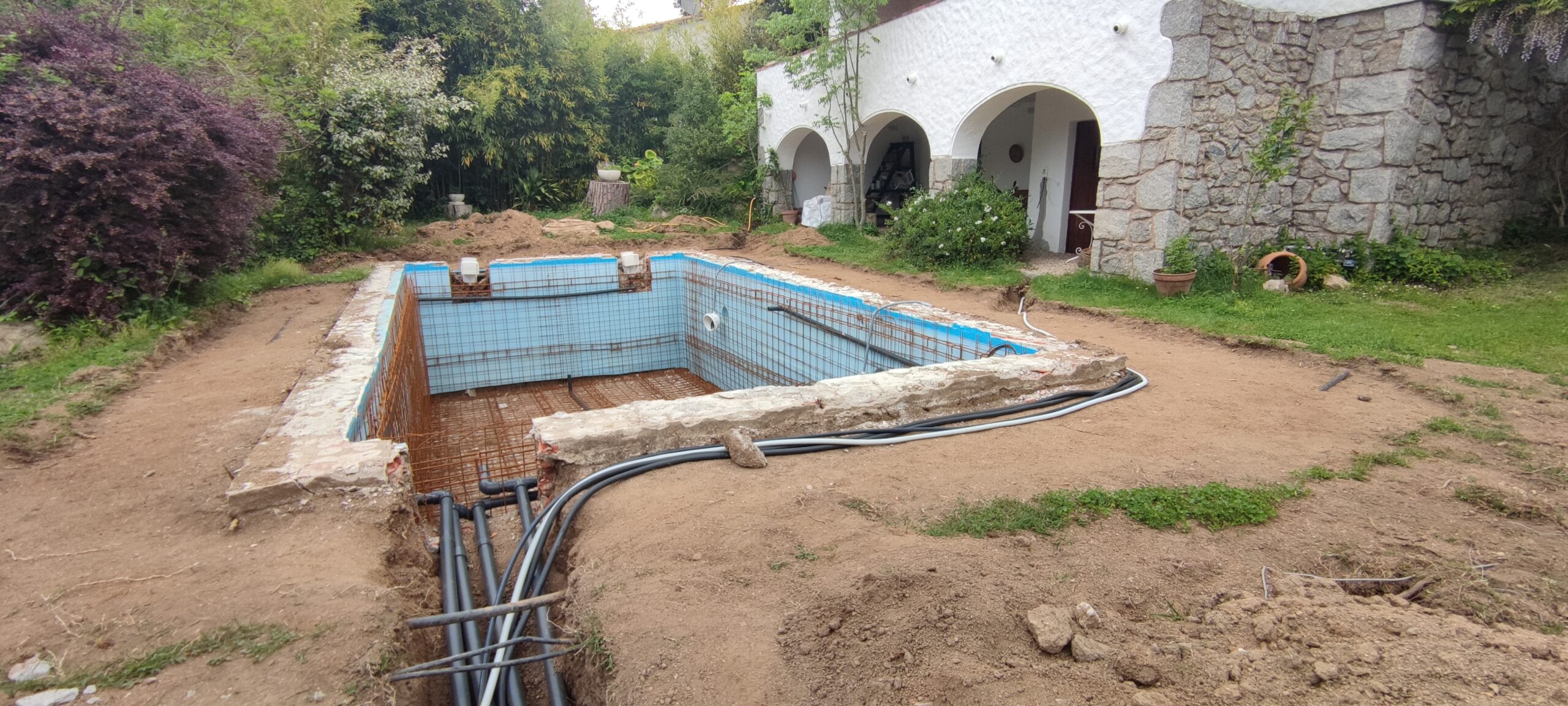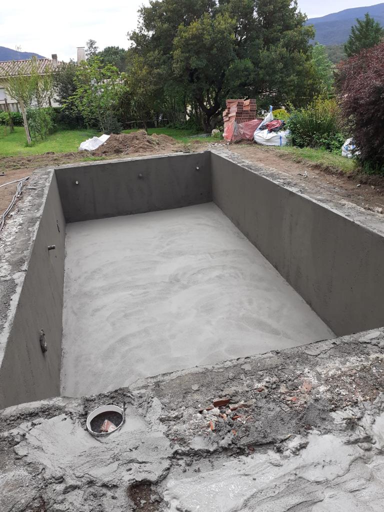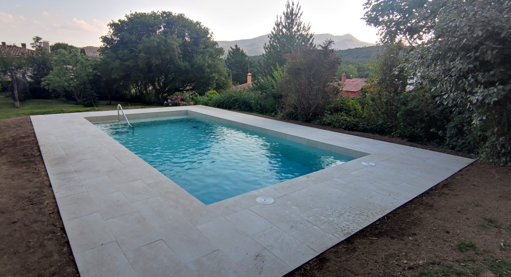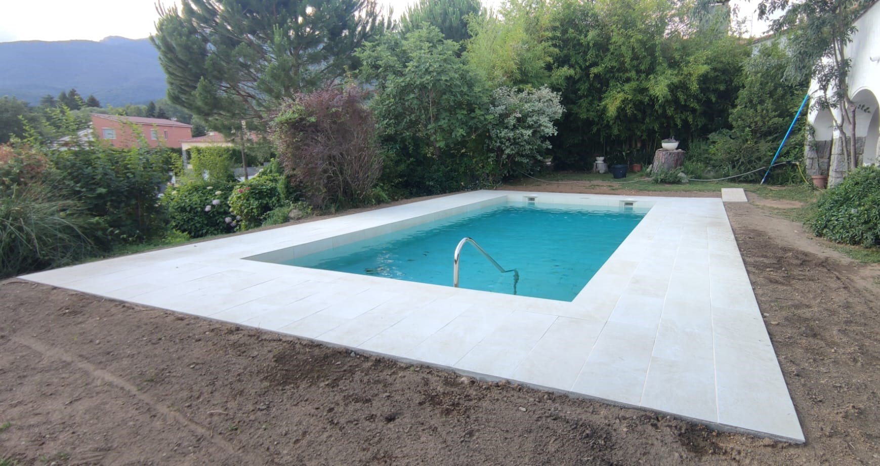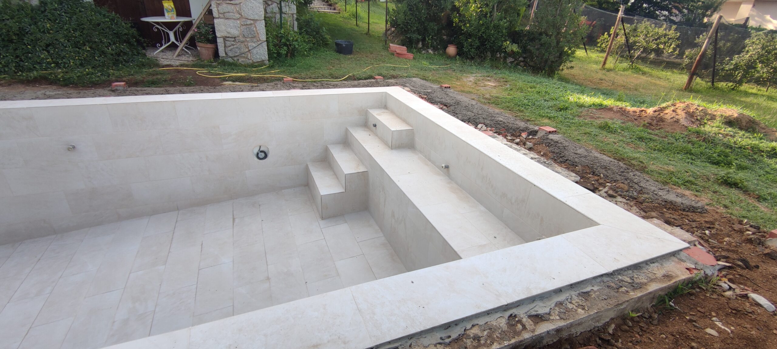 Piscina d’obra nova construida dins una piscina existent de polièster, amb revestiment gres porcelànic del fabricant Cerámica Mayor model Crosscut Petra Out (peça de mides 37,5 x 75 cms). Coronació i terrassa amb gres porcelànic de la mateixa marca.