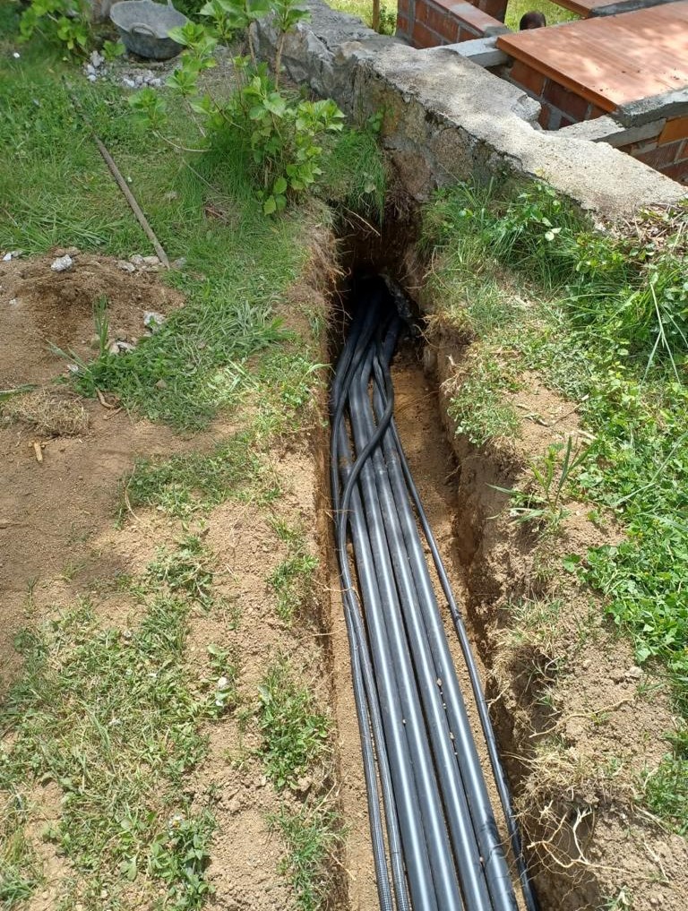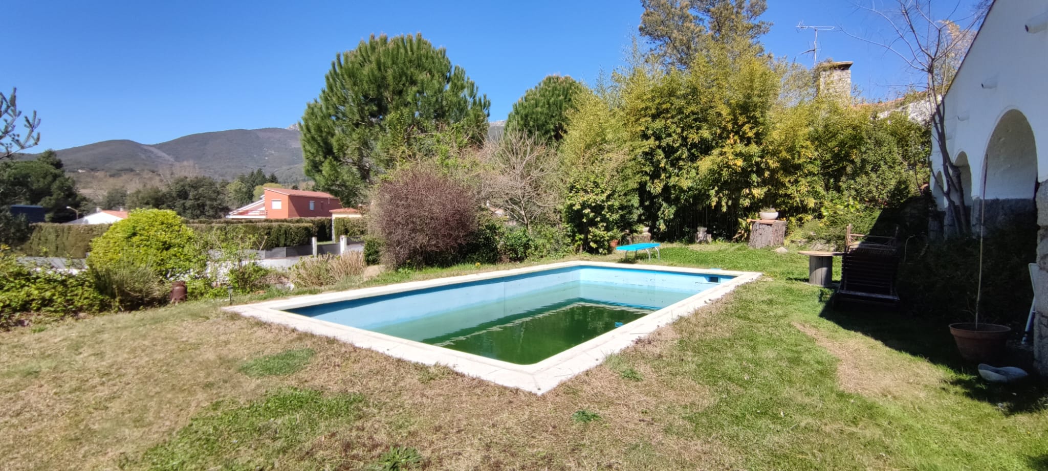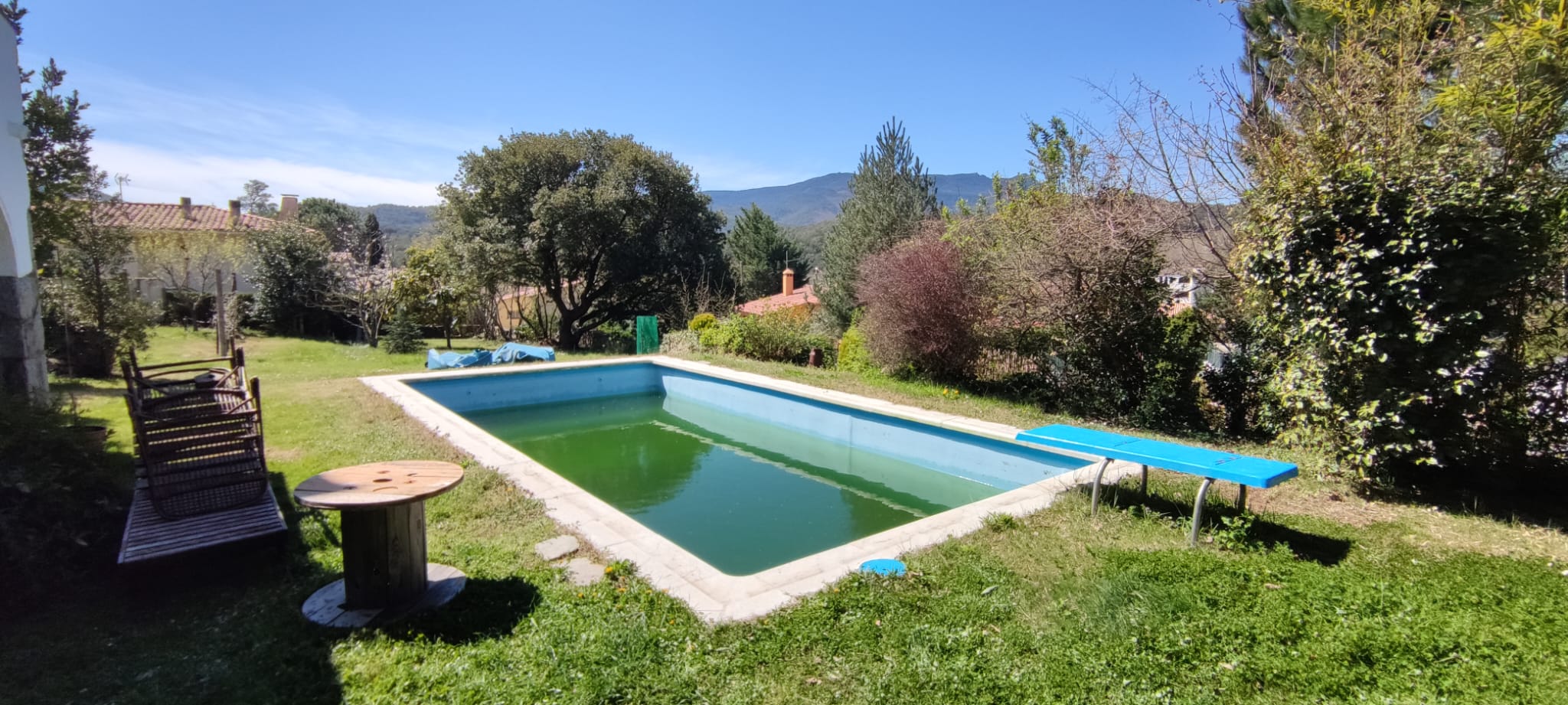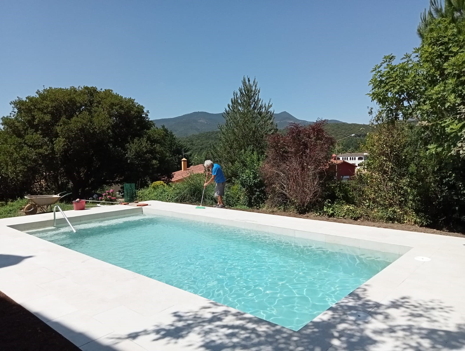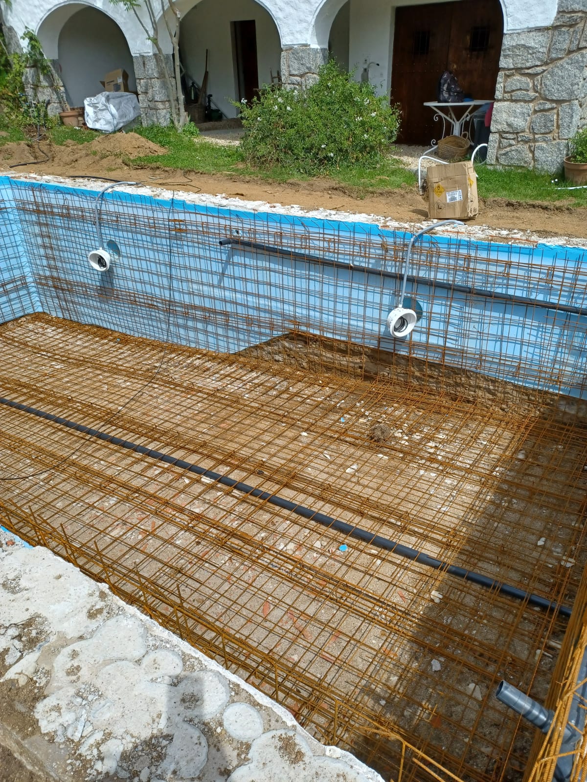 Piscina d’obra nova construida dins una piscina existent de polièster, amb revestiment gres porcelànic del fabricant Cerámica Mayor model Crosscut Petra Out (peça de mides 37,5 x 75 cms). Coronació i terrassa amb gres porcelànic de la mateixa marca.