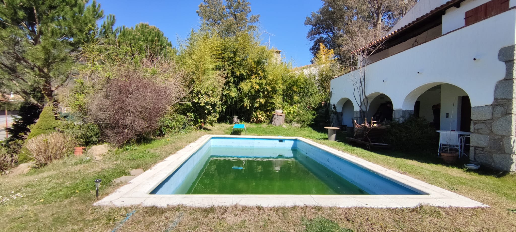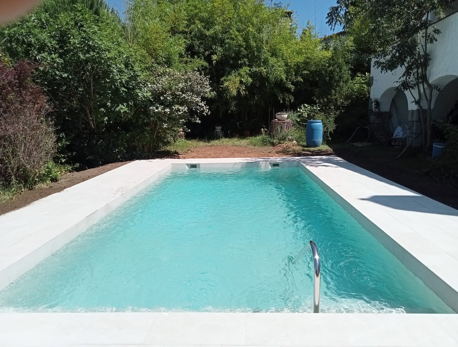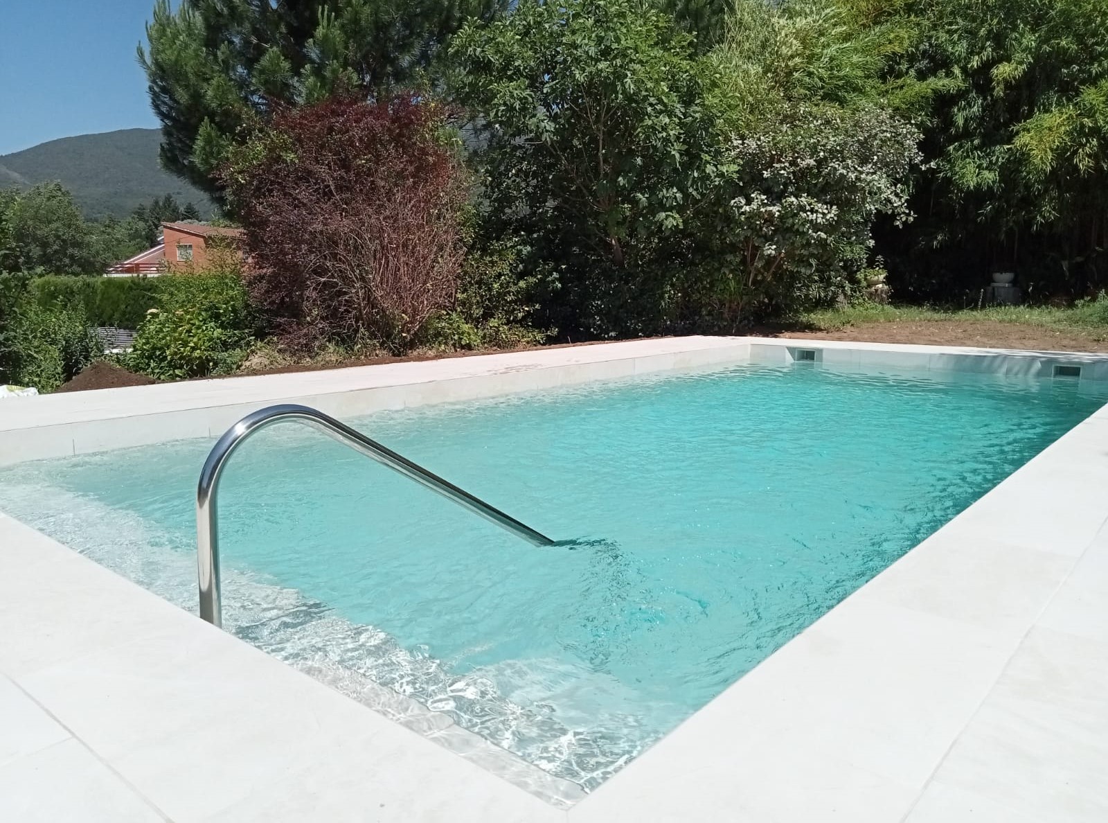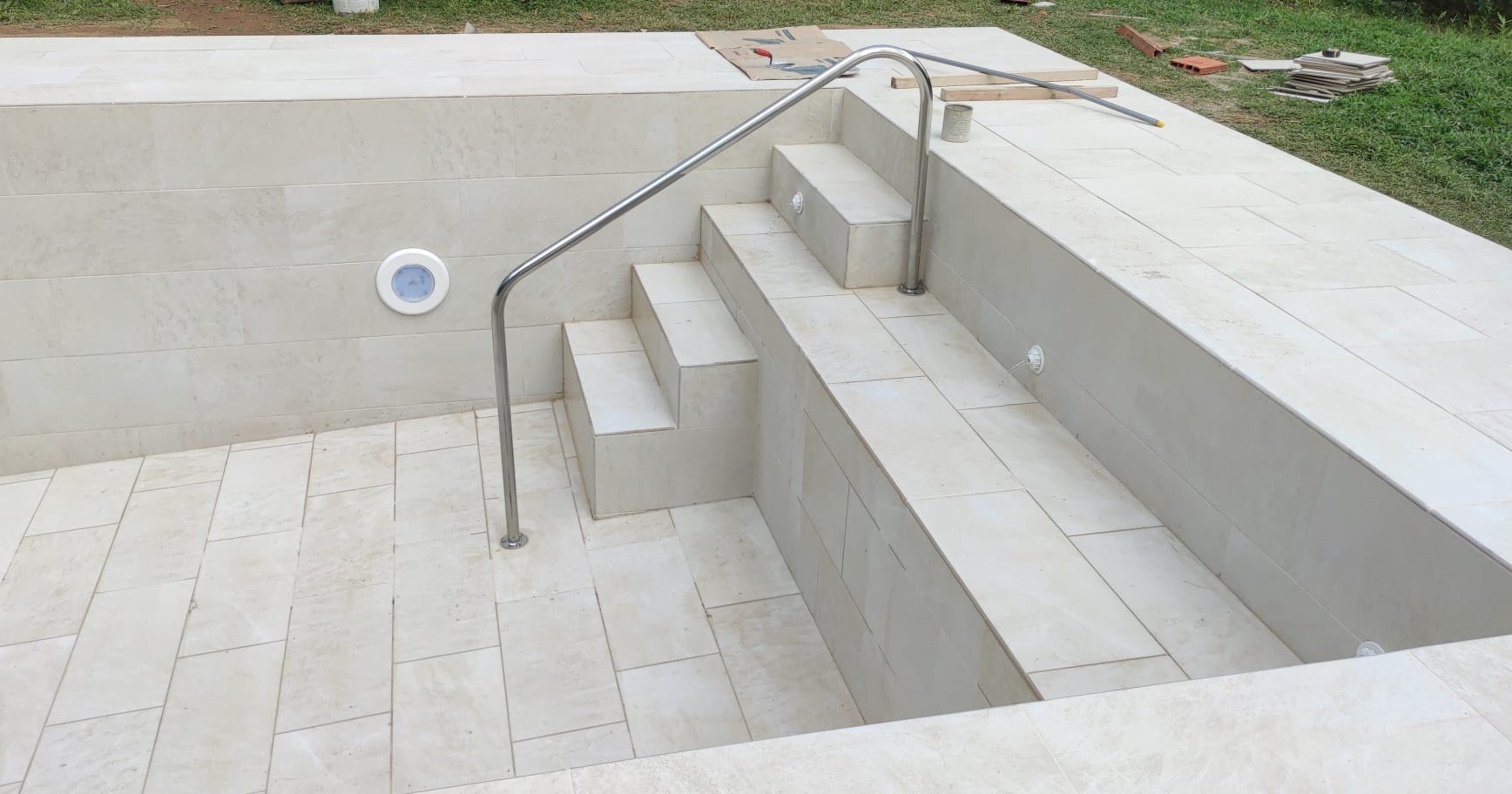 Escala amb barana i banc a l’interior de la piscina.